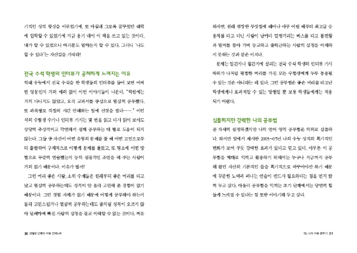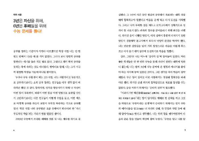 °ÅâÇÑ ÀÇ¹Ì ºÎ¿©ÀÎÁö´Â ¸ð¸£°ÚÁö¸¸, ³ª´Â °í3¿¡¼ »ï¼ö ½ÃÀý±îÁö 3³â µ¿¾ÈÀº ³ª ÀÚ½ÅÀ» À§ÇØ, ±×¸®°í °æÂû´ë¿¡ ÇÕ°ÝÇÑ ÀÌÈÄ Áö±Ý±îÁö 6³â µ¿¾ÈÀº ÈĹèµéÀ» À§ÇØ ¸Å³â ¼ö´É ¹®Á¦¸¦ Ç®¾î ¿Â ¼ÀÀÌ´Ù. ºÎÁ·ÇÏ°í º¸Àß °Í ¾ø´Â ÀÌ Ã¥ÀÌ ¿©·¯ºÐÀÇ ¼ö´É ¿©Á¤¿¡ ³õÀÌ´Â ÀÛÀº ÀÌÁ¤Ç¥°¡ µÇ¾î ÁØ´Ù¸é ´õ ¹Ù¶ö ³ªÀ§°¡ ¾ø°Ú´Ù.