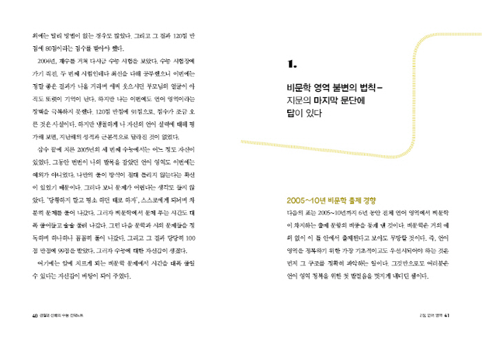 Á¶±Ý ¿ì¿¬ÇÑ °è±â·Î ½ÃÀÛÇÑ ¡®³ªÀÇ °øºÎ¹ý °ËÁõ¡¯Àº 6³âÀ̳ª °è¼ÓµÇ¾ú´Ù. Çѵ¥ ³î¶ó¿î °ÍÀº, ¸Å³â ¾ð¾î ¿µ¿ªÀÇ ¼ö´É ¹®Á¦¸¦ Ç® ¶§¸¶´Ù ±× È¿°ú¼º¿¡ ÀüÇô ÀǽÉÀÇ ¿©Áö°¡ ¾ø´Ù´Â °ÍÀ» È®ÀÎÇÏ°Ô µÈ´Ù´Â °ÍÀÌ´Ù. 6³âÀ̳ª Áö³ Áö±Ý±îÁöµµ, °Ô´Ù°¡ ±×µ¿¾È ¾ð¾î ¿µ¿ªÀÇ ÃâÁ¦ °æÇâ¿¡ ¿©·¯ ¹ø º¯È°¡ ÀÖ¾úÀ½¿¡µµ ¸»ÀÌ´Ù. ±×°ÍÀÌ ¹Ù·Î ³»°¡ °¨È÷ ÀÌ Ã¥À» ¾²±â·Î °á½ÉÇÏ°Ô µÈ °¡Àå Áß¿äÇÑ °è±â¿´´Ù.