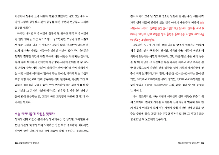 °¢ÀÚÀÇ ½Åü ¸®µëÀ» ½ÇÁ¦ ¼ö´ÉÀÇ ¸ÞÄ¿´ÏÁò Áï ¿µ¿ªº°, °ú¸ñº°·Î ¹èºÐµÈ ½Ã°£¿¡ ¸ÂÃß±â À§ÇØ ³ë·ÂÇÏ´Â ÀÏÀº ¸Å¿ì Áß¿äÇÏ´Ù. ¿Ö³ÄÇϸé À§¿¡¼ ¸»ÇÑ ´ë·Î ÀÚ½ÅÀÇ ½Åü ¸®µë¿¡ ¸ÂÃç °øºÎÇÏ´Â °Í¸¸À¸·Îµµ Á¡¼ö Â÷À̰¡ Å©°Ô ³¯ Á¤µµ·Î Áß¿äÇÑ ÀÏÀε¥, ¹®Á¦´Â ¼ö´É ½ÃÇèÀÌ °¢ÀÚÀÇ ½Åü ¸®µë¿¡ ¸ÂÃçÁ® ÀÖ´Â °ÍÀÌ ¾Æ´Ï±â ¶§¹®ÀÌ´Ù. µû¶ó¼ ¼ö´É ½ÃÇè¿¡¼ ÀÚ½ÅÀÇ ½Ç·ÂÀ» À¯°¨¾øÀÌ ¹ßÈÖÇϰí ÃÖ´ëÀÇ ¼º°ú¸¦ ³»±â À§Çؼ´Â ÀÚ½ÅÀÇ ½Åü ¸®µëÀ» Æò¼Ò ÈÆ·ÃÀ» ÅëÇØ ¼ö´É ½ÃÇèÀÇ ¸ÞÄ¿´ÏÁò¿¡ ¸ÂÃß´Â ¼ö¹Û¿¡ ¾ø´Ù.