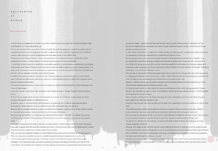 Sumuk is a material and at the same time an emotion. It is a form, but at the same time has substance. The substance is not simply designating a category of subject matter, but a kind of mind system. In truth, the difference between sumuk paintings and other types of paintings can be found here. A new self-awareness and recognition of sumuk painting were unfolded during the series of sumuk painting exhibitions from the late 1970¡¯s and early 1980¡¯s. This series of exhibitions were not a collective presentation of sumuk paintings as a simple genre of art, but had the purpose of a cultural movement in which to pursue our intrinsic affective system through the form of sumuk. The artist at the center of this movement was Song Soo-nam – Kwang-soo Oh (Art Critic)