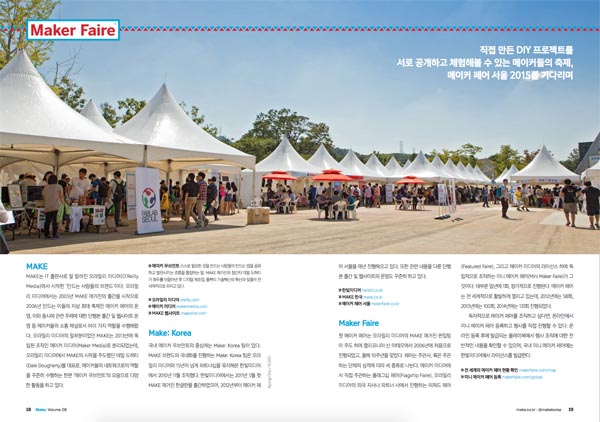 ù Çѱ¹ÆÇ MAKE ¸Å°ÅÁøÀÌ 2011³â 5¿ù Ãâ°£µÆÀ¸´Ï ¾à ¹Ý³âÀÇ Áغñ¸¦ °ÅÃÄ Ã¹ °á°ú¹°ÀÌ ³ª¿Â ¼ÀÀÌ´Ù. ±×¸®°í ÀÏ ³âÀÌ ´õ Áö³ 2012³â 6¿ù¿¡´Â ¸ÞÀÌÄ¿ Æä¾î ¼¿ï(Maker Faire Seoul)À» óÀ½ ½ÃÀÛÇß°í, Æä¾î´Â ±×¶§ºÎÅÍ ¸Å³â ÇÑ ¹ø¾¿ ÁøÇàÇØ¼ ¿ÃÇØ·Î ¹ú½á 4ȸ¸¦ ¸Â¾Ò´Ù.