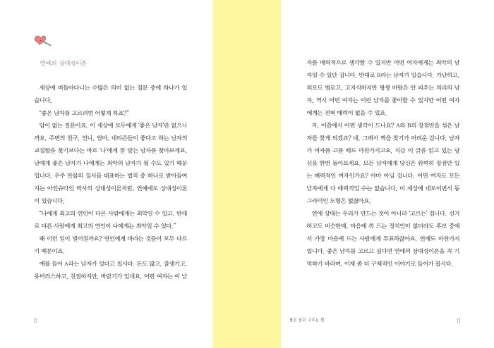 ¡°ÀÌ ¼¼»ó ±× ´©±¸µµ ¡®¿Ïº®ÇÑ »óÅ¡¯¿¡¼ ¿¬¾Ö¸¦ ½ÃÀÛÇÏÁö ¾Ê½À´Ï´Ù. ¿Ïº®ÇÏ°Ô ¸ö¸Å ¸¸µé°í, Áý¾È »óȲµµ ÁÁÀº ½ÃÁ¡¿¡¼, Ä¿¸®¾îµµ ¾ÈÁ¤µÈ »óÅ¿¡¼ ÀÌÁ¦ ³ª´Â µü ¿¬¾ÖÇÒ Å¸À̹ÖÀ̾ß! ÀÌ·¸°Ô ¿¬¾ÖÇÏ±æ ¹Ù¶õ´Ù¸é Æò»ý ¸øÇÕ´Ï´Ù. ±×¸®°í Á» ´õ °¡º¿î ¸¶À½À¸·Î ³²ÀÚ¸¦ ´ëÇϽñæ. Á¶±Ý °úÀåÇØ¼ ¸»ÇÏÀÚ¸é, ³²ÀÚ´Â ¾î·Æ°Ô »ý°¢ÇÒ¼ö·Ï ¾î·Á¿öÁö°í ½±°Ô »ý°¢ÇÒ¼ö·Ï ¸¸¸¸ÇØÁý´Ï´Ù.¡± - 85ÂÊ