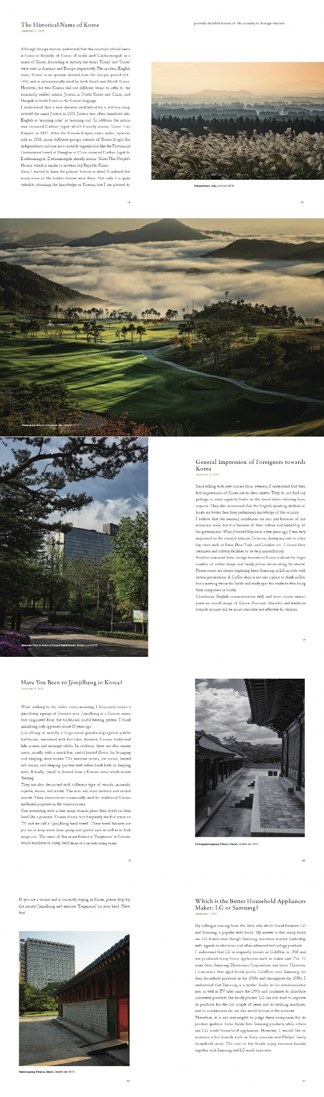 After I finalized the first photo essay called <Way to Work, Yaksudong Street>, I have moved to another stage to introduce Korean culture in English through Facebook in 2013. The reason I started to write English essays on Korean custom is that several overseas colleagues in the hotel industry brought up the question why I did not introduce an English photo essay book for foreigners to better understand Korean culture. After I received various suggestions on the next publication, I started to realize that there is no proper book explaining the latest in local culture including Korean life style. When selecting a reading material for the hotel room guest, the concerned employee is always reluctant to hand an appropriate book which includes good pictures showing Korean life. As an hotelier for over 30 years, I have many chances to meet different types of people and business men from overseas. However, none of them was interested in or ever brought up Korean history. Instead of that, the traveler or the businessmen are more fascinated about the latest Korean fashion, life style, and favorite food and beverage restaurants in Seoul. I understand that in-flight magazines like Morning Calm Magazine from Korean Airlines provide these types of information with pictures. Even so, these magazines are only available in airlines¡¯ cabins. In addition, while Korean hotel staff prepare their VIP room set up for government officials or group chairman from overseas, appropriate photo books in the guest rooms are not easy to find.