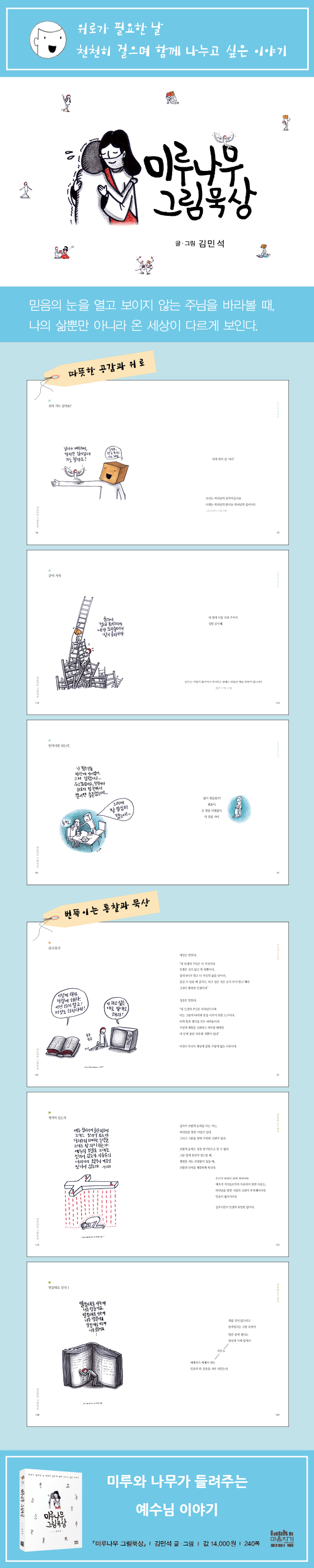 ¸ÅÀÏ ¸»¾¸À» ¹¬»óÇϰí Âù¼ÛÀ» ºÎ¸£¸ç, ±×¶§±×¶§ Çϳª´Ô²²¼ ±ú´Ý°Ô ÇϽô °ÍµéÀ» ²ÙÁØÈ÷ ±×¸²°ú ±Û·Î ³²±â´Â ÀúÀÚ´Â ±×¸² ±×¸®´Â õ±¹ ¹é¼ºÀ¸·Î¼ÀÇ »î¿¡ ´ëÇÑ °¨»ç¸¦ ´ã¾Æ ¡®¹Ì·ç³ª¹« ±×¸²¹¬»ó¡¯À» ¿¬ÀçÇϰí ÀÖ´Ù.