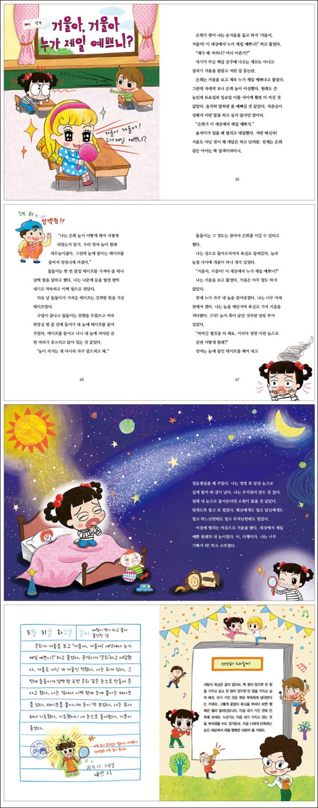 ÀºÈñ°¡ °Å¿ïÀ» º¸°í ¡®°Å¿ï¾Æ, °Å¿ï¾Æ! ¼¼»ó¿¡¼ ´©°¡ Á¦ÀÏ ¿¹»Ú´Ï?¡¯ ÇÏ°í ¹°¾ú´Ù. À±¼®À̰¡ ¡®ÀºÈñ¡¯¶ó°í ´ë´äÇß´Ù. °Å¿ïµµ ¾Æ´Ñ °Ô °Å¿ïÀΠôÇß´Ù. ³ª´Â Ȱ¡ ³µ´Ù. ±×·±µ¥ µ¹µ¹À̰¡ »ï¹é ¿ø ÁÖ¸é ÀºÈñ °°Àº ´«À¸·Î ¸¸µé¾î Áشٰí Çß´Ù. ³ª´Â ±ð¾Æ¼ ÀÌ¹é ¿ø¿¡ ´«¿¡ ºÙÀÌ´Â Å×ÀÌÇÁ¸¦ »ò´Ù. Å×ÀÌÇÁ¸¦ ºÙÀÌ´Ï±î ´«ÀÌ ¸· ºÎ¾ú´Ù. ³ª´Â ¹«¼¿ö¼ ±âµµÇß´Ù. ±âµµÇß´õ´Ï ³» ´«À¸·Î µ¹¾Æ¿Ô´Ù. ±âºÐÀÌ ÁÁ¾Ò´Ù.