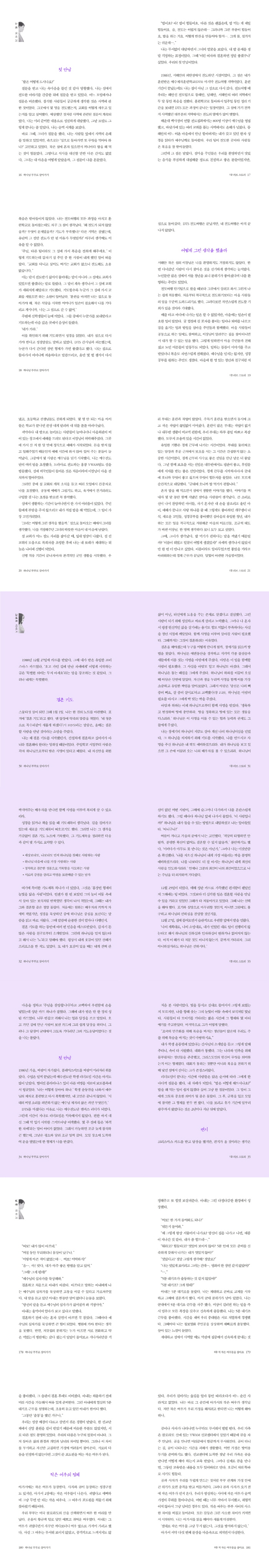 1989³â °áÈ¥ÇÏ°í ¿¹¼öÀüµµ´Ü °£»ç·Î À§Å¹Çؼ Áö±Ý±îÁö ³²Æí È«Àåºó °£»ç¿Í ¸ðµç »ç¿ªÀ» ÇÔ²²Çß´Ù. ³²ÆíÀ» µû¶ó ±¹³»¿Ü·Î ÀæÀº À̵¿À» ÇÏ´Â Áß¿¡ ¼¼ ¾ÆÀ̸¦ ³º°í Ȩ½ºÄð·Î ¾çÀ°Çß´Ù. 2015³â¿¡ ÀÚ³à¾çÀ°¼ ¡¶Çϳª´Ô ¾ÆÀ̷ΠŰ¿ö¶ó¡·¸¦ Ãâ°£ÇÑ ±×³à°¡ À̹ø¿¡´Â ³²Æí°úÀÇ Ã¹ ¸¸³²ºÎÅÍ ÇöÀç±îÁö Çϳª´Ô Áß½ÉÀ¸·Î »ì¾Æ¿Â °áÈ¥»ýȰ ½ºÅ丮¸¦ µé·ÁÁØ´Ù. â¼¼±â 2ÀåÀ» Áß½ÉÀ¸·Î ¸»¾¸À» ¹¬»óÇÏ¸ç ¡®µ½´Â ¹èÇÊ¡¯·Î¼ÀÇ ¾Æ³»ÀÇ ¿ªÇÒÀ» ±¸Ã¼ÀûÀÌ°í ½ÇõÀûÀÎ Áöħ°ú ÇÔ²² Àç¹ÌÀÖ°í °¨µ¿ÀûÀÎ ¿¡ÇǼҵå·Î ¼Ò°³Çϰí ÀÖ´Ù. ±×°£ ÁÖ·Î Áߺ¸±âµµ¿Í ¿µÀûÀüÀïÀ» °ÀÇÇØ¿Ô°í, ÃÖ±Ù¿¡´Â ³²Æí°ú ÇÔ²² °áÈ¥°ú °¡Á¤, ÀÚ³à¾çÀ°À» ÁÖÁ¦·Î ¼±±³ ÇöÀå°ú ±³È¸¸¦ ¼¶±â°í ÀÖÀ¸¸ç, ¡®¿©ÀÚ¶ó¼ ÇູÇÑ ¿¹¹è¡¯ ºäƼǮ¿ö½Ê¿¡¼ ¼³±³ ´ã´ç Áöµµ°£»ç·Î Ȱµ¿Çϰí ÀÖ´Ù.
