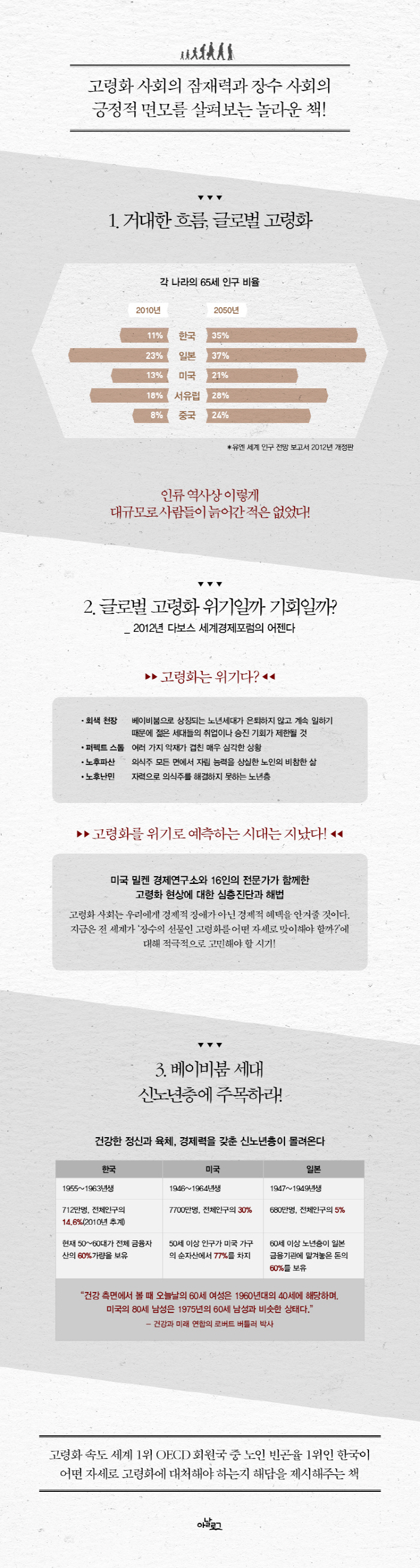 ¢º Àα¸ °í·ÉȰ¡ ¼¼»óÀ» ¹Ù²Ù°í ÀÖ´Ù. ÀÌ °Å´ëÇÑ º¯È´Â ¿ì¸®ÀÇ »îÀ» Çõ½ÅÀûÀ¸·Î ¹Ù²Ü °ÍÀÌ´Ù. Áö±Ý ¿ì¸®¿¡°Ô °í·ÉȺ¸´Ù ´õ Áß¿äÇÏ°í ½Ã±ÞÇÑ ¹®Á¦´Â ¾ø´Ù. ´ÙÇàÈ÷ °íÁ¤°ü³ä°ú Æí°ßµµ »ç¶óÁö°í ÀÖ´Ù. ³ë³â±â¿¡ Á¢¾îµç Àü ¼¼°è ¼ö¹é¸¸ ¸íÀÇ »ç¶÷µéÀÌ »çȸ¿¡ ±â¿©ÇÏ¸ç »ì ¼ö ÀÖ´Â ¹æ¹ýÀ» Àû±ØÀûÀ¸·Î ¸ð»öÇϰí ÀÖ´Ù. 32ÂÊ