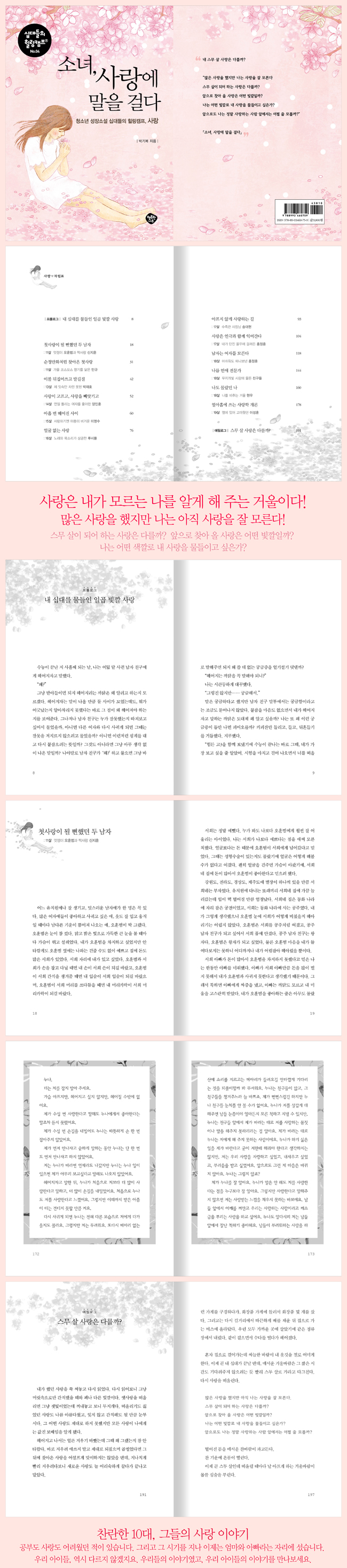 ÀÌ Ã¥ÀÇ ÁÖÀΰøÀÎ ¡®¼Ò³à¡¯°¡ °ÞÀº À̾߱â´Â ÀüºÎ ÁøÂ¥´Ù. ÀÛ°¡°¡ Áö¾î³½ °ÍÀÌ ¾Æ´Ï¶ó Á÷Á¢ µéÀº À̾߱⸦ ¼Ò¼³·Î ¿Å±ä °ÍÀÌ´Ù. ¼Ò³à´Â ¸ÚÁø 11»ì ³²ÀÚ¾ÆÀ̺ÎÅÍ ¼¤Çª ³¿»õ°¡ ÁÁÀº 18»ì ³²Çлý±îÁö, ¸¹Àº ³²ÀÚÄ£±¸µé°ú À̸® ºÎµúÄ¡°í Àú¸® ºÎµúÄ¡¸é¼ »ç¶ûÀ» ¹è¿ö³ª°£´Ù. ±×·¯¸é¼ ¼Ò³à´Â Àڽŵµ ¸ô¶ú´ø ¶Ç ´Ù¸¥ ÀÚ½ÅÀÇ ¸ð½ÀÀ» ¹ß°ßÇÑ´Ù. ½Î¿ì°í Çì¾îÁö´Â °úÁ¤À» °ÞÀ¸¸é¼ »ç¶÷ÀÇ µÊµÊÀ̰¡ ¾î¶°ÇØ¾ß ÇÏ´ÂÁö, °¡¸£ÃÄÁÖÁö ¾Ê¾Æµµ »ç¶÷¿¡ ´ëÇÑ ¿¹ÀÇ¿Í ÁøÁ¤¼ºÀÌ ¿Ö ÇÊ¿äÇÑ °ÍÀÎÁö¸¦ ¹è¿ì°Ô µÈ´Ù. ¸Â´Ù. »ç¶ûÀº ¹Ù·Î ÀÌ·± °ÍÀÌ´Ù. ½º½º·Î¸¦ ¼ºÂûÇÒ ¼ö ÀÖ´Â ±âȸ¿Í ¾î¶² »îÀ» »ì¾Æ¾ß ÇÒ °ÍÀΰ¡¸¦ ¾Ë·ÁÁÖ´Â ¿ì¸®µéÀÇ ¼ºÀåÅëÀÌ´Ù.