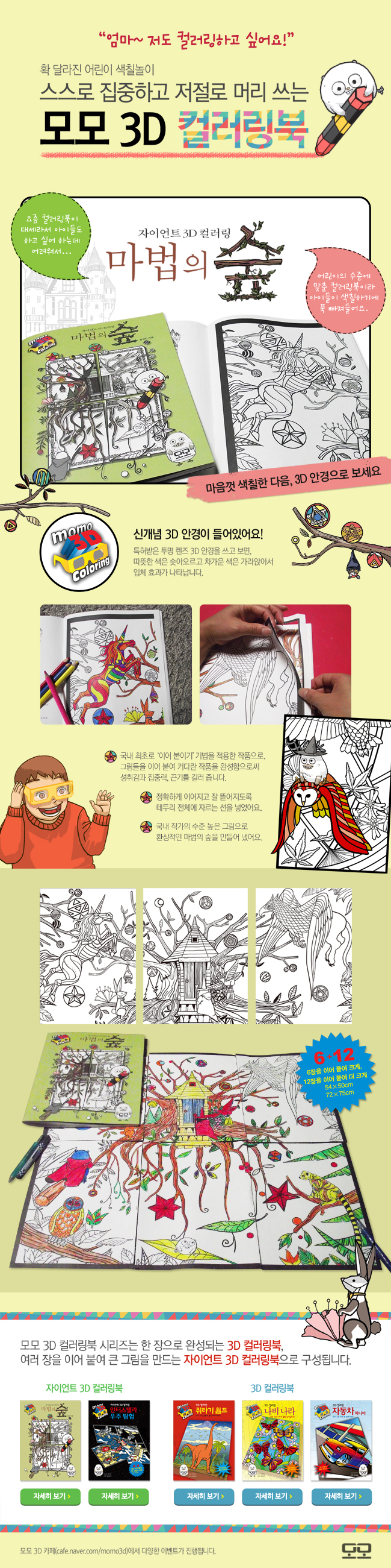 ¡¶ÀÚÀÌ¾ðÆ® 3D Ä÷¯¸µ ¸¶¹ýÀÇ ½£¡·Àº ¾î¸°À̵éÀÌ ½º½º·Î ÁýÁßÇÏ¸ç ²ö±â¸¦ Ű¿ì°í, ¼ºÃë°¨µµ ¸Àº¼ ¼ö ÀÖµµ·Ï ±âȹµÇ¾ú½À´Ï´Ù. ÀÌ Ã¥Àº ±×¸² ÇÑ À帶´Ù µ¶¸³¼ºÀÌ ÀÖÀ¸¸é¼ ³ªÁß¿¡ ¼·Î ÀÌ¾î ºÙÀ̸é Å« ±×¸²À¸·Î ¿Ï¼ºµË´Ï´Ù. È¥ÀÚ »öÄ¥Çϰí ÀÌ¾î ºÙ¿©µµ Àç¹ÌÀÖ°í »ÑµíÇÏÁö¸¸, °¡Á·À̳ª ¶Ç·¡ Ä£±¸µé°ú °°ÀÌ ÇØµµ Áñ°Ì½À´Ï´Ù. ¿©·¯ ¸íÀÌ ÇÔ²² ÇÒ ¶§¿¡´Â ¼·Î µ½°í º£Çª´Â ¸¶À½À» ºÏµ¸¾Æ ÁÖ´Â È¿°úµµ ÀÖ½À´Ï´Ù. Å« ±×¸²ÀÌ ¿Ï¼ºµÇ¸é ±×°ÍÀ» º®À̳ª ÆÇ¿¡ ºÙÀÔ´Ï´Ù. ±×·± ´ÙÀ½¿¡ Ã¥ ¼Ó¿¡ ÀÖ´Â 3D ¾È°æÀ» ¾²°í º¸¸é Á¤¸» ¸¶¹ý¿¡ ºüÁø ±âºÐÀÌ µé °ÍÀÔ´Ï´Ù. °£´ÜÇÑ ÀÔü È¿°ú ¿ø¸®¸¦ Âü°íÇÏ¿© ¾î´À ºÎºÐÀ» ´õ µ¸º¸ÀÌ°Ô ÇÒÁö »ý°¢ÇÏ¸ç »öÄ¥ÇÏ´Â µ¿¾È ³îÀÌÀÇ Áñ°Å¿ò°ú µÎ³ú ÀÚ±Ø È¿°ú¸¦ ¾Æ¿ï·¯ ´©¸± ¼ö ÀÖ½À´Ï´Ù.