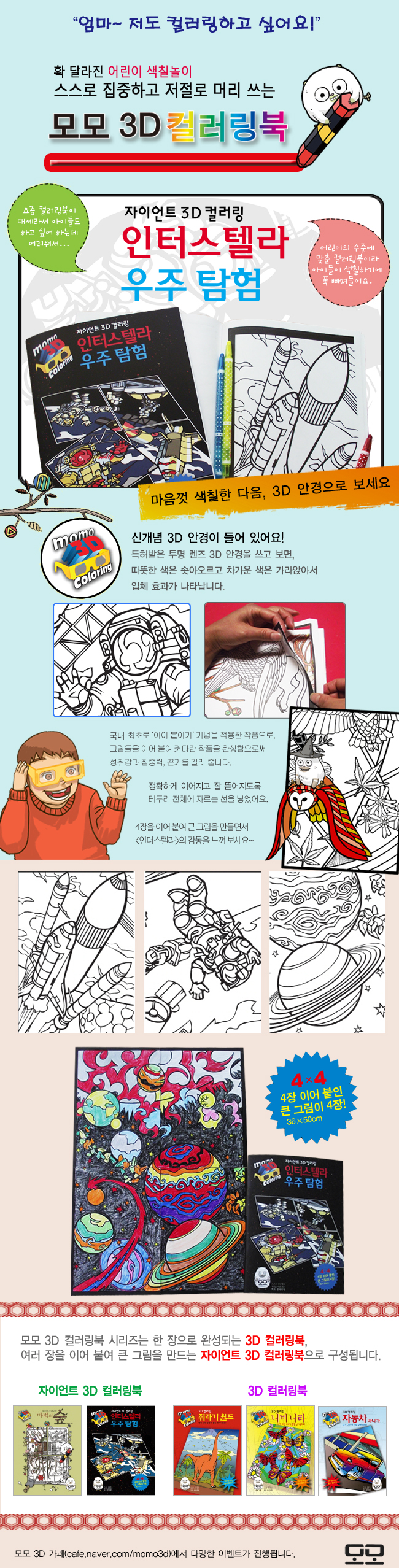¡¶ÀÚÀÌ¾ðÆ® 3D Ä÷¯¸µ ÀÎÅͽºÅÚ¶ó ¿ìÁÖ Å½Çè¡·Àº ¾î¸°À̵éÀÌ ½º½º·Î ÁýÁßÇÏ¸ç ²ö±â¸¦ Ű¿ì°í, ¼ºÃë°¨µµ ¸Àº¼ ¼ö ÀÖµµ·Ï ±âȹµÇ¾ú½À´Ï´Ù. ÀÌ Ã¥Àº ÇÑ Àå ÇÑ Àå »öÄ¥À» ÇÏ°í ³ª¼ ³ªÁß¿¡ ¼·Î ÀÌ¾î ºÙÀ̸é Å« ±×¸²À¸·Î ¿Ï¼ºµË´Ï´Ù. È¥ÀÚ »öÄ¥Çϰí ÀÌ¾î ºÙ¿©µµ Àç¹ÌÀÖ°í »ÑµíÇÏÁö¸¸, °¡Á·À̳ª ¶Ç·¡ Ä£±¸µé°ú °°ÀÌ ÇØµµ Áñ°Ì½À´Ï´Ù. ¿©·¯ ¸íÀÌ ÇÔ²² ÇÒ ¶§¿¡´Â ¼·Î µ½°í º£Çª´Â ¸¶À½À» ºÏµ¸¾Æ ÁÖ´Â È¿°úµµ ÀÖ½À´Ï´Ù. Å« ±×¸²ÀÌ ¿Ï¼ºµÇ¸é ±×°ÍÀ» º®À̳ª ÆÇ¿¡ ºÙÀÔ´Ï´Ù. ±×·± ´ÙÀ½¿¡ Ã¥ ¼Ó¿¡ ÀÖ´Â 3D ¾È°æÀ» ¾²°í º¸¸é ±×¸²ÀÌ ÀÔü·Î »ì¾Æ³ª Á¤¸» ¿ìÁÖ¸¦ ¶°´Ù´Ï´Â ±âºÐÀÌ µé °ÍÀÔ´Ï´Ù. °£´ÜÇÑ ÀÔü È¿°ú ¿ø¸®¸¦ Âü°íÇÏ¿© ¾î´À ºÎºÐÀ» ´õ µ¸º¸ÀÌ°Ô ÇÒÁö »ý°¢ÇÏ¸ç »öÄ¥ÇÏ´Â µ¿¾È ³îÀÌÀÇ Áñ°Å¿ò°ú µÎ³ú ÀÚ±Ø È¿°ú¸¦ ¾Æ¿ï·¯ ´©¸± ¼ö ÀÖ½À´Ï´Ù.