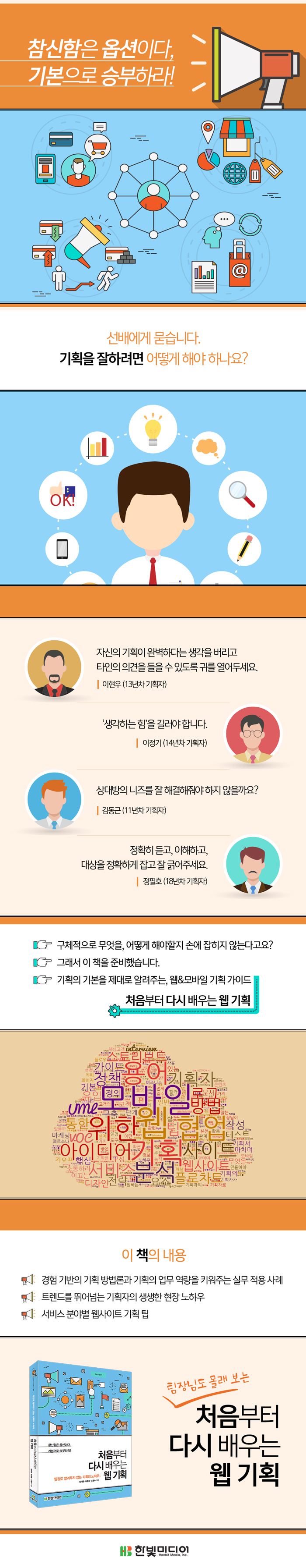 ¿©´ü °³ÀÇ Ã©ÅÍ·Î ±¸¼ºµÈ ÀÌ Ã¥Àº ±âȹÀÇ ¿Ã¹Ù¸¥ ÀÌÇØ¸¦ µ½±â À§ÇÑ Á¤ÀÇ¿Í ±âȹ °úÁ¤¿¡¼ ¾Ë¾ÆµÖ¾ß ÇÒ ±âº» °³³äµéÀ» ´ã¾Ò½À´Ï´Ù. Å©°Ô ¼¼ ÆÄÆ®·Î ³ª´² Part 1Àº ±âȹÀÚ°¡ ¾Ë¾Æ¾ß ÇÒ ±âº» »ó½Ä°ú ½Ç ±âȹ ³ëÇϿ츦 ´ã¾Æ óÀ½ À¥ ±âȹÀ» Á¢ÇÏ´Â ±âȹÀÚ¿¡°Ô ¾ÕÀ¸·Î Àü°³µÉ Á÷¹«¿¡ ´ëÇÑ ÀÌÇØ¸¦ µµ¿ÔÀ¸¸ç Part 2´Â ½ÇÀü À¥»çÀÌÆ® ±¸ÃàÇϱâ·Î ±âȹÀÚ°¡ ½Ç¹«¿¡¼ ÇÏ°Ô µÉ ±âº»ÀûÀÎ µµ±¸ÀÇ ÀÌÇØ¿Í Á¤Ã¥ Á¤ÀÇ ¹× ½Ç¹« ¼³°è ±â¹ýÀ» Àû¿ëÇÑ ½ºÅ丮º¸µå ÀÛ¼º °¡À̵带 Á¦°øÇÏ¿´½À´Ï´Ù. Part 3Àº ±âȹÀÚÀÇ ¼ºÀåÀ» À̲ô´Â ÆÁÀ¸·Î ¾ÕÀ¸·Î ¼º°øÀûÀÎ ±âȹÀÚ·Î ¹ßÀüÇϱâ À§ÇÑ ³ëÇÏ¿ì¿Í ¹æÇâÀ» Á¦½ÃÇÏ¿´½À´Ï´Ù.