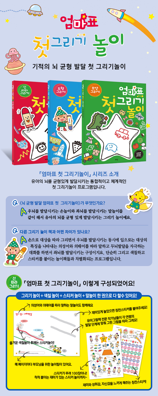 ¡º¾ö¸¶Ç¥ ù ±×¸®±â³îÀÌ¡» ´Â ¼ÕÀ¸·Î ´ë»óÀ» µû¶ó ±×¸®´Â µ¿½Ã¿¡ ÀÔÀ¸·Î´Â ¾ö¸¶¸¦ µû¶ó¼ ´ë»óÀÇ Æ¯Â¡À» ³ªÅ¸³»´Â ÀǼº¾î¿Í ÀÇž ¸»ÇÏ°í µÎ³ú¹ß´ÞÀ» ÃËÁøÇÏ´Â ´ëȸ¦ ÇÏ´Â ±¸¼ºÀ¸·Î ±âÁ¸ ±×¸®±â³îÀÌ Ã¥°ú Å©°Ô Â÷º°ÈµÇ´Â Ã¥ÀÔ´Ï´Ù. ù ±×¸®±â³îÀÌ 1´Ü°è´Â <¼± µû¶ó ±×¸®±â>ÀÔ´Ï´Ù. ¼±À» µû¶ó ±×¸®¸é¼ Å©·¹ÆÄ½º¸¦ Àâ´Â ÈûÀÌ »ý±â¸é ´Ù¾çÇÑ ¼±À» ±×¸± ¼ö ÀÖ°í µµÇüµµ ±×¸± ¼ö ÀÖ°Ô µË´Ï´Ù. 2´Ü°è <µµÇü ±×¸®±â>·Î ³Ñ¾î°¡¸é ÀÚ¿¬½º·´°Ô ±âÇÏÇÐÀÇ ±âÃʸ¦ ½×À» ¼ö ÀÖ¾î¿ä. ´õ Àͼ÷ÇØÁö¸é 3´Ü°è <¸ð¾ç ±×¸®±â>¿¡¼ ÀÚµ¿Â÷, ºñÇà±â, °ø·æ, ¹«´ç¹ú·¹, ²É, µå·¹½º¿Í °°ÀÌ ÁÁ¾ÆÇÏ´Â ¸ð¾çÀ» ±×¸®°í »öÄ¥³îÀ̵µ ÇÒ ¼ö ÀÖ¾î¿ä.