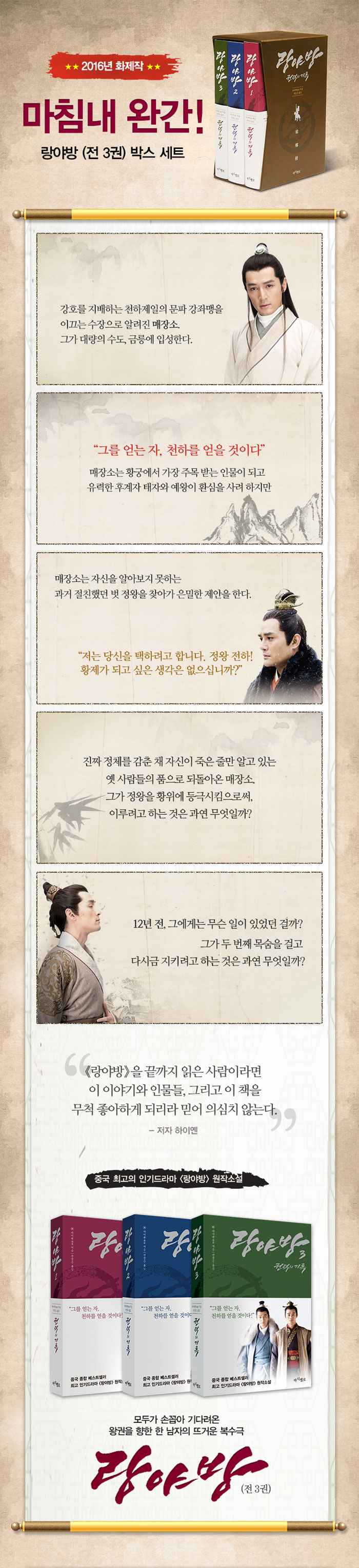 ÃÑ 3±ÇÀ¸·Î ÀÌ·ç¾îÁø ÀÌ ¼Ò¼³Àº ¿Õ±ÇÀ» µÑ·¯½Ñ Ä¡¿ÇÑ ¾ÏÅõ¿Í º¹¼ö, ¿ìÁ¤°ú »ç¶û, Àΰ£ º»¼ºÀ» ÆÄÇìÄ£ ÈÁ¦ÀÇ ¹«ÇùÁ¤Ä¡»ç±ØÀ¸·Î, 2011³â Áß±¹ ¿Â¶óÀÎ ¼Ò¼³ ¿¬Àç »çÀÌÆ®¿¡¼ Å« Àα⸦ ²ö µÚ, µ¶ÀÚµéÀÇ ¿äûÀ¸·Î Ã¥À¸·Î Ãâ°£µÇ¾î ¼Á¡°¡¿¡ µ¹Ç³À» ÀÏÀ¸Å² ÀÛǰÀÌ´Ù. -MDÃßõ
