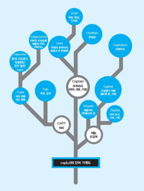 ¿¹¸¦ µé¸é ¿µ¾îÀÇ cap(ut)Àº ¡®¸Ó¸®¡¯¸¦ ¶æÇÏ´Â ÇüżҴÙ. ÇÑÀÚ·Î Ä¡¸é ¡®¸Ó¸® ¼ö âÏ¡¯ ÀÚ³ª ¡®À¸¶ä ¿øêª¡¯(»ç¶÷ÀÇ ¸Ó¸®¸¦ Å©°Ô ±×¸° ÇÑÀÚ)¿¡ ¼ÓÇÑ´Ù. capt¶ó´Â ÇüżҴ ¼ö¸¹Àº ¿µ¾î ´Ü¾î¿¡ µîÀåÇϴµ¥, ¾î´À ¶§´Â t°¡ ¶³¾îÁø capÀ̶ó´Â ÇüÅ·Î, ¾î´À ¶§´Â capÀÇ ÇÁ¶û½º½Ä º¯ÇüÀÎ chef¶ó´Â ÇüÅ·Π³ª¿Â´Ù. ¿¹¸¦ µé¾î¼ ÇÑ µµ½ÃÀÇ ¡®¸Ó¸® µµ½Ã(¼öµµ)¡¯¸¦ capital city¶ó°í Çϰí, ¿ì¸®°¡ °Ç¹°¿¡¼ °¡Àå ±âÃʰ¡ µÇ´Â µ¹À» ¡®¸Ó¸´µ¹¡¯À̶ó°í ÇϵíÀÌ »ç¾÷À» ÇÒ ¶§ °¡Àå ¸ÕÀú ³»·Á³õ´Â ÀÚº»±ÝÀ» capitalÀ̶ó°í Çϸç, ÇÑ ¹«¸®ÀÇ ¿ìµÎ¸Ó¸®, ¶Ç´Â ¼öÀåÀ» captainÀ̳ª chief¶ó°í ÇÑ´Ù.