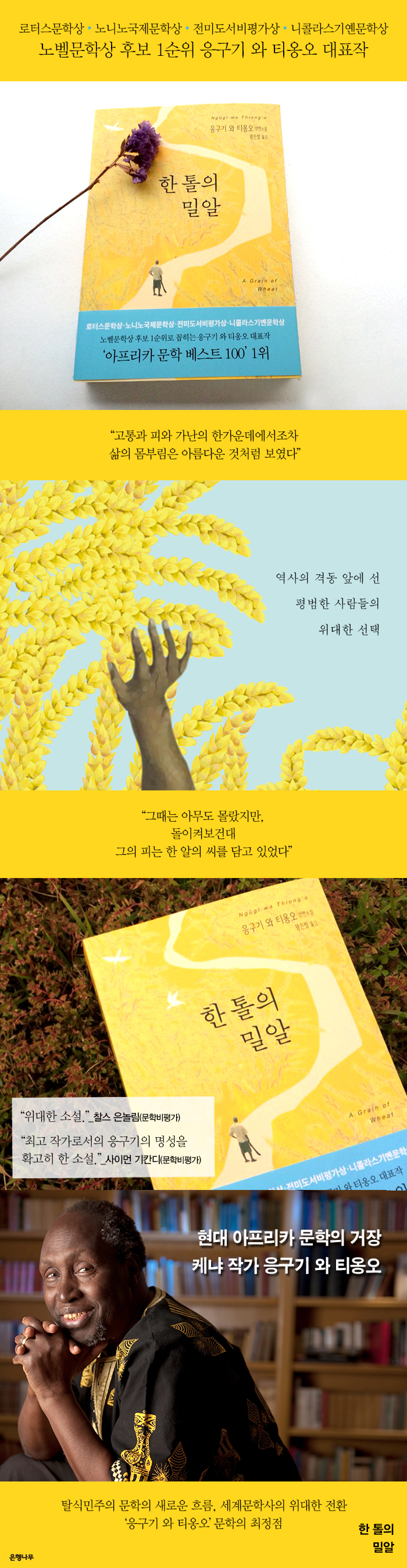 (1938)Çö´ë ¾ÆÇÁ¸®Ä« ¹®ÇÐÀ» ´ëÇ¥ÇÏ´Â ÀÛ°¡ÀÌÀÚ, Å»½Ä¹ÎÁÖÀÇ ¹®ÇÐÀ» ÁÖµµÇؿ °ÅÀå. 1938³â ¿µ±¹ ½Ä¹ÎÁö¹èÇÏÀÇ ÄɳĿ¡¼ ž´Ù. 1950³â´ë¿¡ ¼ö³â°£ Áö¼ÓµÈ ¸¶¿ì¸¶¿ì ¹«ÀåºÀ±â¿¡ °¡Á·µéÀ» ºñ·ÔÇÑ ¸¹Àº À̵éÀÌ ¿¬·çµÇ¾î °íÃʸ¦ °Þ´Â ¸ð½ÀÀ» ÁöÄѺ¸¸ç ÀÚ¶ú´Ù. ½Ä¹ÎÁö ÄɳÄÀÇ ÀÏ·ù °íµîÇб³ÀÎ ¾ó¶óÀ̾𽺸¦ °ÅÃÄ ¿ì°£´Ù ¸¶ÄÉ·¹·¹ ´ëÇп¡¼ ¿µ¹®ÇÐÀ» Àü°øÇϸç ù Èñ°î ¡¸ÈæÀÎ ÀºµÐÀÚ¡¹¸¦ ÁýÇÊ, »ó¿¬ÇÑ´Ù. ÀÌÈÄ ¿µ±¹ÀÇ ¸®Áî ´ëÇп¡ ÀÔÇÐ, ÀçÇÐ Áß¿¡ µ¿¾ÆÇÁ¸®Ä« Ãâ½Å ÀÛ°¡°¡ ¾´ ù ¿µ¹® ¼Ò¼³ÀÎ ¡º¿ïÁö ¸¶, ¾ÆÀ̾ߡ»¸¦ ¹ßÇ¥Çϰí, ¡º»û°¡» ¡ºÇÑÅçÀÇ ¹Ð¾Ë¡»À» ÀÕ´Þ¾Æ Ãâ°£ÇÏ¸ç ¼¼°èÀûÀÎ ÀÛ°¡·Î ¶°¿À¸¥´Ù. 1977³â ÀÛ ¡ºÇÇÀÇ ²ÉÀٵ须À» ÀüÈÄ·Î ÇÑÃþ ´õ »çȸÁÖÀÇÀûÀ̰í Å»½Ä¹ÎÁÖÀÇÀûÀÎ ÀüȯÀ» º¸¿©Áִµ¥, ÀÌÈÄ Á¦ÀÓ½º ÀÀ±¸±â¶ó´Â ¿µ¾î À̸§µµ ¹ö¸®°í, ÁýÇÊ È°µ¿ ¿ª½Ã ¿µ¾î ´ë½Å ±âÄíÀ¯¾î¿Í ½º¿ÍÈú¸®¾î·Î À̾´Ù. °°Àº ÇØ, ½Å½Ä¹ÎüÁ¦ÀÇ ½Ç»óÀ» °í¹ßÇÑ Ç³ÀÚ±Ø ¡¸°áÈ¥Àº ³»°¡ ÇÏ°í ½ÍÀ» ¶§ ÇÑ´Ù¡¹¸¦ ±âÄíÀ¯¾î·Î ÁýÇÊ, »ó¿¬ÇÏÁö¸¸, ´ç±¹¿¡ ÀÇÇØ »ó¿¬ Áß´ÜµÇ°í ±³µµ¼Ò¿¡ Åõ¿ÁµÈ´Ù. ¡º½ÊÀÚ°¡ À§ÀÇ ¾Ç¸¶¡»´Â ¼ö°¨ Áß¿¡ ÈÀåÁö¿¡ ½á³»·Á°£ ÀÛǰÀ¸·Î ±×ÀÇ Ã¹ ±âÄíÀ¯¾î ¼Ò¼³ÀÌÀÚ, ÃÖÃÊÀÇ ±âÄíÀ¯¾î Çö´ë ¼Ò¼³·Î, ÀÛ°¡ÀÇ ¹®Çм¼°è ¹× ¾ÆÇÁ¸®Ä« ¹®Çл翡¼ Áß¿äÇÑ Àǹ̸¦ Áö´Ñ´Ù. ±¹Á¦»ç¸éÀ§¿øÈ¸ÀÇ µµ¿òÀ¸·Î Ç®·Á³ µÚ ¹Ì±¹À¸·Î ¸Á¸íÇÏ¿© ¿¹ÀÏ ´ëÇÐ, ´º¿å ´ëÇÐ µî¿¡¼ °ÀǸ¦ ÇßÀ¸¸ç ÇöÀç ͏®Æ÷´Ï¾Æ ´ëÇп¡¼ ºñ±³¹®ÇÐ ±³¼ö·Î ÀçÁ÷ ÁßÀÌ´Ù. ·ÎÅͽº ¹®Çлó, ³ë´Ï³ë ±¹Á¦¹®Çлó, Àü¹Ìµµ¼ºñÆò°¡Çùȸ»ó, ´Ï²Ã¶ó½º±â¿º ¹®Çлó µîÀ» ¼ö»óÇßÀ¸¸ç, 2009³â¿¡´Â ¸ÇºÎÄ¿»ó ÃÖÁ¾Èĺ¸¿¡ ¿Ã¶ú°í, ¸Å³â À¯·ÂÇÑ ³ëº§ ¹®Çлó ¼ö»ó È帷Π²ÅÈ÷°í ÀÖ´Ù.