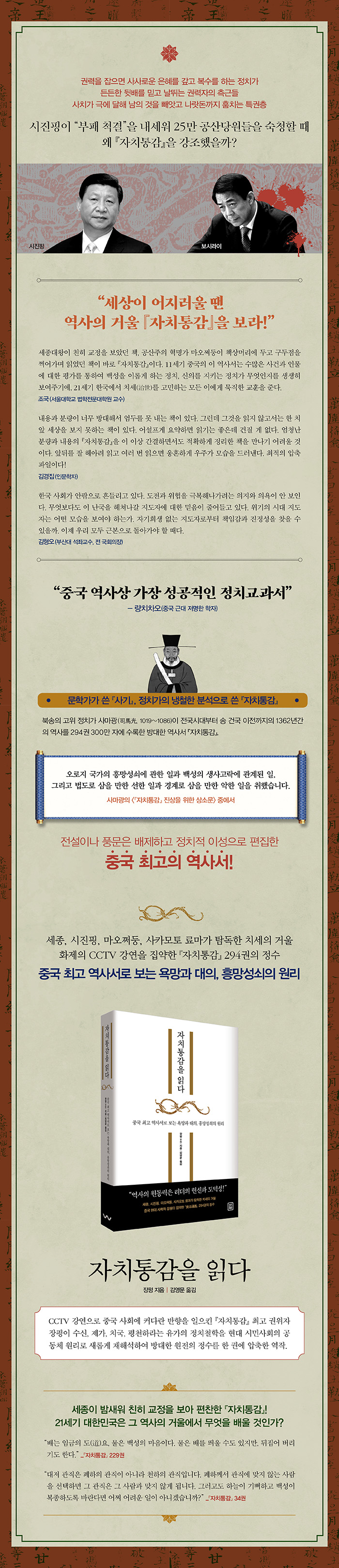 ¼º±º ¼¼Á¾´ë¿ÕÀÌ ÈÆÀÇ(ýºëù) ÀÛ¾÷À» ¸íÇϰí Ä£È÷ ±³Á¤À» º¸¾Ò´ø Ã¥, °ø»êÁÖÀÇ Çõ¸í°¡ ¸¶¿À¼µÕÀÌ Ã¥»ó¸Ó¸®¿¡ µÎ°í ±¸µÎÁ¡À» Âï¾î°¡¸ç Àоú´ø Ã¥ÀÌ ¹Ù·Î ¡ºÀÚÄ¡Åë°¨¡»ÀÌ´Ù. 11¼¼±â Áß±¹ÀÇ ÀÌ ¿ª»ç¼´Â ¼ö¸¹Àº »ç°Ç°ú Àι°¿¡ ´ëÇÑ Æò°¡¸¦ ÅëÇÏ¿© ¹é¼ºÀ» ÀÌ·Ó°Ô ÇÏ´Â Á¤Ä¡, ½ÅÀǸ¦ ÁöŰ´Â Á¤Ä¡°¡ ¹«¾ùÀÎÁö¸¦ »ý»ýÈ÷ º¸¿©Áֱ⿡, 21¼¼±â Çѱ¹¿¡¼ Ä¡¼¼(ö½á¦)¸¦ °í¹ÎÇÏ´Â ¸ðµç ÀÌ¿¡°Ô ¹¬Á÷ÇÑ ±³ÈÆÀ» ÁØ´Ù. _Á¶±¹(¼¿ï´ëÇб³ ¹ýÇÐÀü¹®´ëÇпø ±³¼ö)