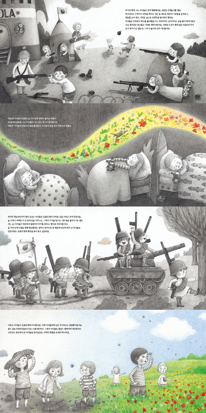³×¸ð³ ÆøÅº Áý°ú ³ôÀÌ ¼ÚÀº ¹Ì»çÀÏ °Ç¹°ÀÌ µé¾îÂù ¹«±âÀÇ ¶¥. ¹«±âÀÇ ¶¥ ¾ÆÀ̵éÀº ³¯¸¶´Ù Çб³¿Í Áý¿¡¼ ÃÑÀ» ½î°í, ÅÊÅ©¸¦ ¸ô°í, ÆøÅº°øÀ» Â÷°í ³î¾Æ¿ä. ¸ÅÀÏ ¹ã ã¾Æ¿À´Â ³ª»Û ²Þ¸¸ »©¸é ¹«±âÀÇ ¶¥Àº ±× ¾ÆÀ̵鿡°Ô Á¤¸» ÇູÇÑ °÷ÀÌÁö¿ä. ²Þ¼Ó¿¡¼ ¾ÆÀ̵éÀº ¹«±âÀÇ ¶¥°ú ÀüÇô ´Ù¸¥ ÃÊ·ÏÀÇ ¶¥À» º¸¾Ò¾î¿ä. ±×°÷ ¾ÆÀ̵éÀº ³ªºñ¸¦ ÂÑ¾Æ´Ù´Ï¸ç ±î¸£¸£ ¿ô°í, ¸Ç¹ß·Î °³¿ï¿¡¼ Âû¹ÚÂû¹Ú °É¾î ´Ù´Ï°í, ÃàÃàÇÑ ÈëÀ¸·Î ÆÄÀ̸¦ ¸¸µé¸ç ³î¾Ò¾î¿ä. ±×·¯¸é¼ ÀÚ²Ù¸¸ ¹«±âÀÇ ¶¥ ¾ÆÀ̵鿡°Ô ±×¸®·Î ¿À¶ó°í ¼ÕÁþÀ» ÇÏ´Â °Ô ¾Æ´Ï°Ú¾î¿ä? ¹«±âÀÇ ¶¥ ¾ÆÀ̵éÀº ¹ã¸¶´Ù ÀڽŵéÀ» Àá ¸ø µé°Ô ÇÏ´Â ¹«¼¿î ²Þ ¶§¹®¿¡ ´Ü´ÜÈ÷ Ȱ¡ ³µ¾î¿ä. °á±¹ ¹«±â¸¦ µé°í, ÅÊÅ©¿Í ÁöÇÁÂ÷¸¦ Ÿ°í ÃÊ·ÏÀÇ ¶¥À¸·Î ÇàÁøÇßÁö¿ä.