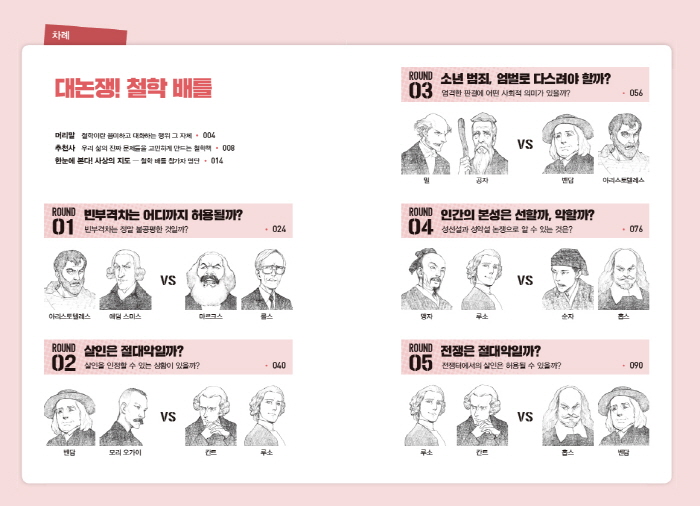 ½Ã´ë¿Í Àå¼Ò¸¦ ÃÊ¿ùÇØ À§´ëÇÑ »ç»ó°¡µéÀÌ ¸¸³ª¸é ¹«½¼ ´ëȰ¡ ¿À°í°¥±î? °¡·É ¾Ö´ý ½º¹Ì½º¿Í ¸¶¸£Å©½º, ±×¸®°í ·Ñ½º°¡ ¸¸³ª ºóºÎ°ÝÂ÷¿¡ ´ëÇØ ³íÀïÇÑ´Ù¸é À̵éÀº ¾î¶² ÁÖÀåÀ» ÆîÄ¥±î? ½ÅÀÇ Á¸Àç¿¡ ´ëÇØ Ä®¹ð°ú ¾ß½ºÆÛ½º, Æ÷À̾î¹ÙÈå¿Í ´Ïü´Â ¾î¶»°Ô ¸»ÇÒ±î? ÀÌ·¯ÇÑ ±Ã±ÝÁõÀ» ¸ð¾Æ ÇÑ ±ÇÀÇ Ã¥À¸·Î ¿«¾ú´Ù. ¡º´ë³íÀï! öÇÐ ¹èƲ¡»Àº ¼ÒÅ©¶óÅ×½ºÀÇ ¹®´ä¹ýÀ» Ȱ¿ëÇØ µ¿¼°í±Ý ÁÖ¿ä »ç»ó°¡µéÀÌ ¼·Î öÇÐÀû Áú¹®À» ´øÁö°í ³íÀïÀ» ¹úÀÌ°Ô ÇÔÀ¸·Î½á ´©±¸³ª ¼Õ½±°Ô öÇÐÀ» ½ÃÀÛÇÒ ¼ö ÀÖµµ·Ï ¾È³»ÇÏ´Â ´ëÈ Çü½ÄÀÇ Ã¶ÇÐ ÀÔ¹®¼´Ù. ¼ÒÅ©¶óÅ×½º, ¾Æ¸®½ºÅäÅÚ·¹½º, °øÀÚ, ÀåÀÚ, ¼®°¡¸ð´Ï¸¦ ºñ·ÔÇØ º£ÀÌÄÁ, µ¥Ä«¸£Æ®, ÄÆ®, ·ç¼Ò, ´Ïü, ·Ñ½º µî ÀÌ Ã¥À» ÅëÇØ ÇÑÀÚ¸®¿¡ ¸ðÀÎ 37ÀÎÀÇ »ç»ó°¡´Â ¡®Àΰ£Àº ¹«¾ùÀ» À§ÇØ »ç´Â°¡¡¯ °°Àº ¿µ¿øÇÑ Ã¶ÇÐÀû Áú¹®¿¡¼ºÎÅÍ ¡®¼Ò³â ¹üÁ˸¦ ¾î¶»°Ô ´Ù½º·Á¾ß Çұ¶ó´Â Çö½Ç ¹®Á¦¿¡ À̸£±â±îÁö ´Ù¾çÇÑ Áú¹®À» ´øÁö¸ç ¡®Ã¶ÇÐ ¹èƲ¡¯À» ¹úÀδÙ.