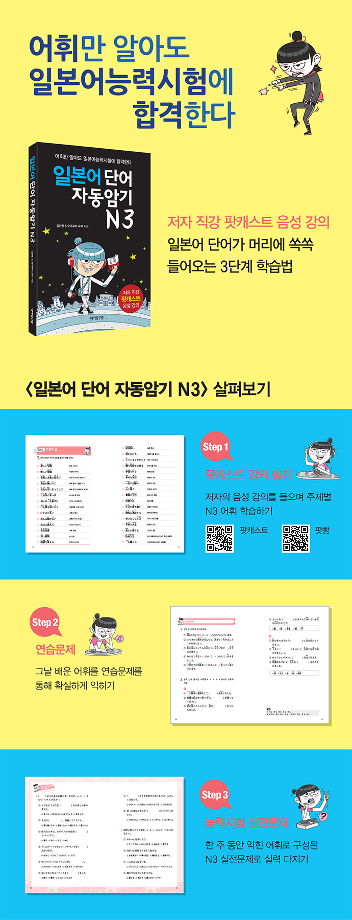 ÀϺ»¾î´É·Â½ÃÇè N3 ¾îÈÖ¸¦ ÆÌij½ºÆ® ÀúÀÚ °ÀǸ¦ µéÀ¸¸ç ½±°Ô ÀÍÈú ¼ö ÀÖµµ·Ï±¸¼ºÇÑ Ã¥ÀÌ´Ù. È¥ÀÚ¼ Ã¥¸¸ º¸´Â °Íº¸´Ù ÀúÀÚÀǰÀǸ¦ µéÀ¸¸ç ÇнÀÇÏ¸é ¸î ¹è ´õ È¿°úÀûÀ¸·Î ÀϺ»¾î ¾îÈÖ¸¦ ½ÀµæÇÒ ¼ö ÀÖ´Ù. ±âÁ¸ÀÇ ´É·Â½ÃÇè ¾îÈÖ Ã¥Ã³·³ µüµüÇÏ°Ô Ç°»çº°·Î Á¤¸®µÈ °ÍÀÌ ¾Æ´Ï¶ó, ÁÖÁ¦º°·Î °ü·Ã ¾îÈÖ¸¦ ÇÔ²² ¹è¿òÀ¸·Î½á ´õ Àß ±â¾ïµÇµµ·Ï ¸¸µé¾ú´Ù. °ÀÇ Ã»Ãë ÈÄ¿£ ¿¬½À¹®Á¦¸¦ ÅëÇØ ±×³¯ ¹è¿î ¾îÈÖµéÀ»ÇÑ ¹ø ´õ È®ÀÎÇϰí, 5°³ÀÇ ÁÖÁ¦·Î ±¸¼ºµÈ ÇÑ ÆÄÆ®°¡ ³¡³¯ ¶§¸¶´Ù ´É·Â½ÃÇè ½ÇÀü¹®Á¦·Î ´É·Â½ÃÇè¿¡ ÀûÀÀÇϵµ·Ï ÇÏ¿´´Ù.