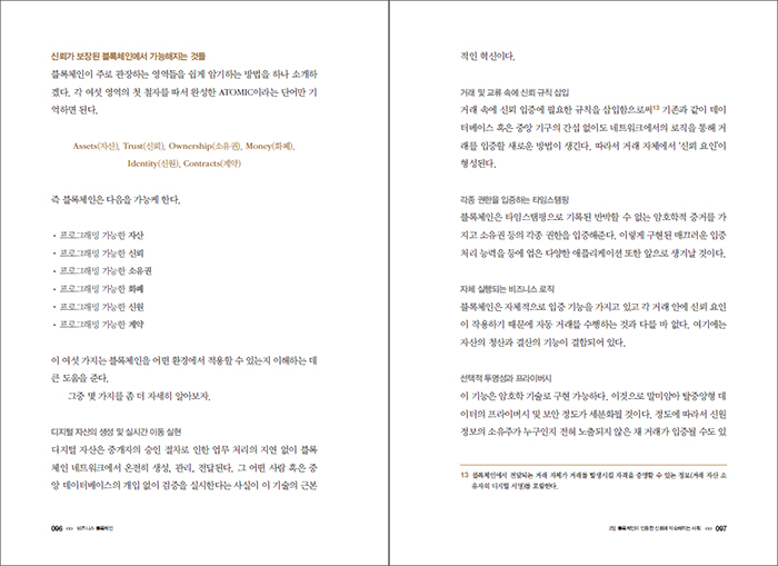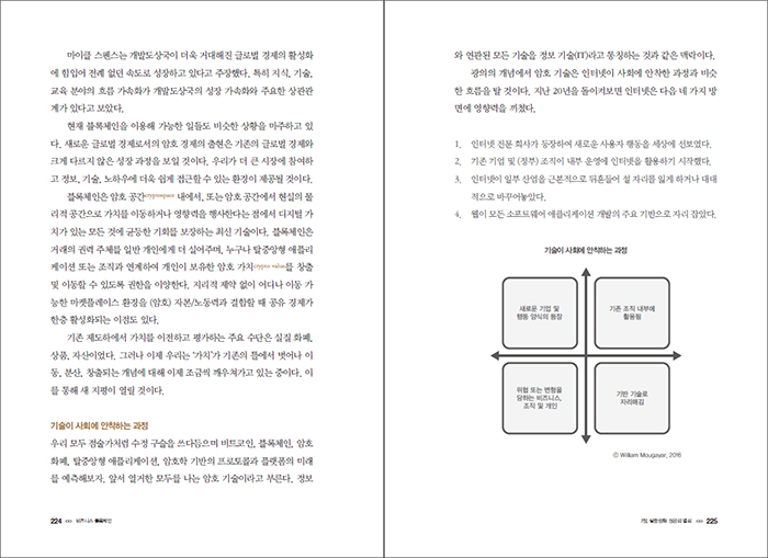 ÀÌ Ã¥¿¡´Â ³»°¡ Áö³ 34³â°£ ±â¼ú ºÐ¾ß¿¡ ¸ö´ãÀ¸¸ç üµæÇÑ °æÇè°ú ½Ä°ßÀÌ ´ã°Ü ÀÖ´Ù. ±× ¼¼¿ùÀÇ Ã¹ 14³âÀº ÈÞ·¿ ÆÑÄ¿µå¿¡¼, ÀÌÈÄ 1995³âºÎÅÍ 2005³â±îÁöÀÇ ÀÎÅÍ³Ý ¹ßÀü»ç¿Í ÇÔ²²ÇÑ 10³âÀº µ¶¸³ ÄÁ¼³ÅÏÆ®, ÀÛ°¡, ÀÎÇ÷ç¾ð¼·Î¼ Ȱµ¿Çß´Ù. (...) 2005³â ³ª´Â ÄÁ¼³ÆÃ ±â°ü ¾Ö¹öµò ±×·ì¿¡¼ Àü¹® ¾Ö³Î¸®½ºÆ®·Î ÈÆ·Ã¹Þ°í ¾à 3³â°£ ÄÚ±×´ÏÀüÆ®¿¡¼ ÄÁ¼³ÅÏÆ®·Î¼ Àü ¼¼°è¸¦ ¹«´ë·Î ¹ú¾îÁö´Â Â÷ÀÍ °Å·¡¸¦ Àü´ãÇϸç ÁøÁ¤ÇÑ ÀǹÌÀÇ ¹«±¹Àû ±â¾÷ÀÌ ¹«¾ùÀÎÁö ¸öÀ¸·Î ºÎµúÄ¡¸ç ¹è¿ü´Ù. 2008³âÀ» ±âÁ¡À¸·Î ¾à 5³â°£ ³ª´Â µÎ °³ÀÇ ½ºÅ¸Æ®¾÷À» Â÷·Á ³ª¸§ÀÇ ¼º°ú¸¦ ¿Ã·È´Ù. (...) 2013³â ºñÆ®ÄÚÀΰú ºí·ÏüÀÎ ¼¼»óÀ» ¹ß°ßÇÑ ¼ø°£Àº 1995³â ³ª¸¦ ºñ·ÔÇÑ ¸î ¸íÀÇ »ç¶÷µéÀÌ ÀÎÅͳÝÀÌ ÀÌ ¼¼»óÀ» µÚÁýÀ» ¸¸Å ´ë´ÜÇÑ ±â¼úÀ̶ó´Â °ÍÀ» ¾Ë°í ÈïºÐÀ» °¡¶ó¾ÉÈ÷Áö ¸øÇß´ø ±â¾ïÀ» µÇ»õ±â°Ô Çß´Ù. (31~33ÂÊ)