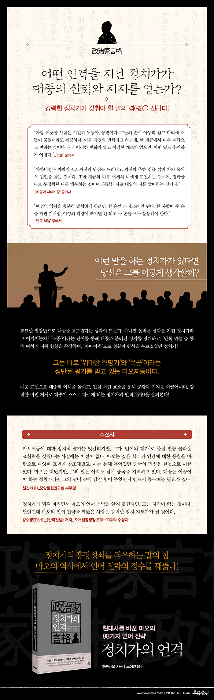 ÀÌ Ã¥Àº Áß±¹ÀÇ ±¹È¥ÀÌÀÚ ¿ª»ç»ó °¡Àå °·ÂÇÑ Á¤Ä¡°¡¿´´ø ¸¶¿À¼µÕÀÇ 88°¡Áö ¾ð¾î Àü·«À» ÅëÇØ °·ÂÇÑ Á¤Ä¡°¡°¡ °®Ãç¾ß ÇÒ ¡®¸»ÀÇ °Ý¡¯ÀÌ ¹«¾ùÀΰ¡¿¡ ´ëÇÑ È®½ÇÇÑ ±âÁØÀ» Á¦½ÃÇÑ´Ù. ÀÌ Ã¥¿¡¼´Â ¾î·Á¿î ¸»·Î Áö½ÄÀ» »Ë³»°Å³ª, À¯·ÁÇÑ ¹®Àå°ú ¾ðº¯À¸·Î ´ëÁßÀ» ¹ÌȤÇÏ´Â °ÍÀÌ ¾Æ´Ï¶ó ¡®ÀÚ½ÅÀÇ »ý°¢À» ÀϰüµÇ°Ô Àü´ÞÇϰí, ½¬¿î Ç¥ÇöÀ¸·Î ´ëÁßÀÇ ÀÌÇØµµ¸¦ ³ôÀ̸ç, °·ÂÇÑ ºñÀü Á¦½Ã·Î ´ëÁßÀÌ ½º½º·Î µû¸£°Ô ÇÏ´Â °Í¡¯À̶ó°í ÁÖÀåÇÑ´Ù. - MD Ãßõ