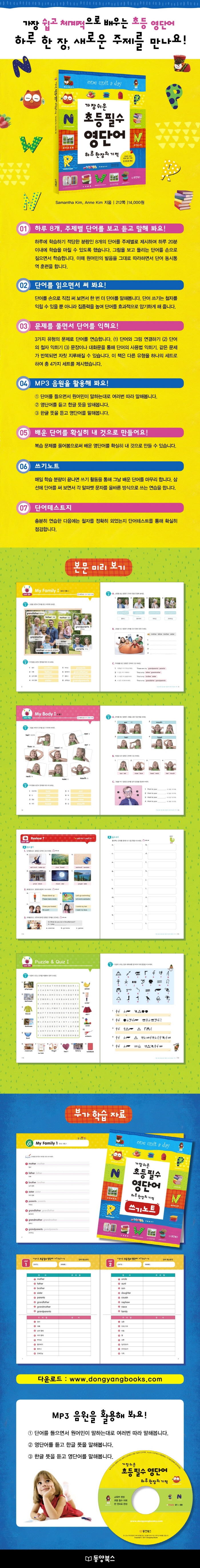 <°¡Àå ½¬¿î Ãʵî Çʼö ¿µ´Ü¾î ÇÏ·ç ÇÑ ÀåÀÇ ±âÀû>Àº ÃʵîÇлýµéÀÌ ±³À°ºÎ ±ÇÀå Ãʵî Çʼö ¿µ´Ü¾î¸¦ °¡Àå ½±°í ü°èÀûÀ¸·Î ¹è¿ï ¼ö ÀÖµµ·Ï ¸¸µé¾îÁø Ã¥ÀÔ´Ï´Ù. ÇÏ·ç¿¡ ±âº» 8°³ ´Ü¾î¸¦ ¿Ü¿ì´Â °úÁ¤À» ÅëÇØ¼ ºÎ´ã ¾ø´Â ÇнÀÀ» ÇÒ ¼ö ÀÖÀ¸¸ç, Ä£¼÷ÇÑ ÁÖÁ¦·Î ¿«¿© ´Ü¾îµéÀÌ ¼·Î ¿¬»óÀÛ¿ëÀ» ÀÏÀ¸Å°±â ¶§¹®¿¡ º¸´Ù È¿°úÀûÀ¸·Î ´Ü¾î¸¦ ¿Ü¿ï ¼ö ÀÖ½À´Ï´Ù. ´Ù¾çÇÑ ¹æ½ÄÀ¸·Î ´Ü¾î¸¦ µû¶óÇÏ°í ¿Ü¿ï ¼ö ÀÖ´Â MP3°¡ Á¦°øµÇ¾î À½¿øÀ» µè´Â °Í¸¸À¸·Îµµ ´Ü¾î ÇнÀÀÌ °¡´ÉÇϰí, ¾²±â³ëÆ®¿Í ´Ü¾îÅ×½ºÆ®Áö°¡ Á¦°øµÇ¾î ´Ü¾îÀÇ Ã¶ÀÚ¸¦ Á¤È®Çϰí È®½ÇÇÏ°Ô ¿Ü¿ï ¼ö Àֱ⵵ ÇÕ´Ï´Ù. ¡®ÀÛÀº º¯È°¡ Å« Â÷À̸¦ ¸¸µç´Ù¡¯¶ó´Â ¸»ÀÌ ÀÖ½À´Ï´Ù. ÇÑ ÀåÀ» °øºÎÇÑ´Ù°í ´çÀå ¿µ¾î¸¦ ÀßÇÒ ¼ö´Â ¾øÁö¸¸ ÇÏ·ç¿¡ ÇÑ ÀåÀÌ ½×ÀÌ°í ½×À̸é Å« Â÷À̸¦ ¸¸µé¾î, ±Ã±ØÀûÀ¸·Î ÀÌ Ã¥ <°¡Àå ½¬¿î Ãʵî Çʼö ¿µ´Ü¾î ÇÏ·ç ÇÑ ÀåÀÇ ±âÀû>À» ÅëÇØ ÃÊµî °úÁ¤¿¡ ÇÊ¿äÇÑ ¿µ´Ü¾î¸¦ ¸ðµÎ Á¤º¹ÇÏ´Â Áñ°Å¿î °æÇèÀ» ÇÏ°Ô µÉ °ÍÀÔ´Ï´Ù.