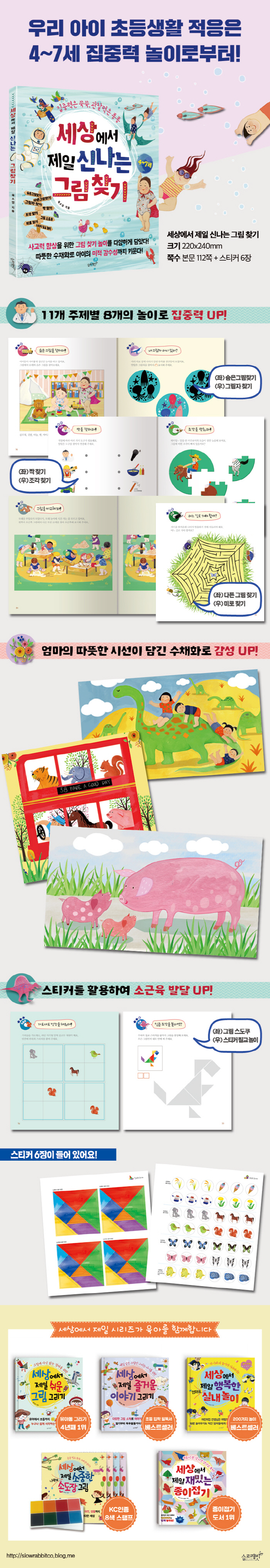 ½Ã°¢Àû ÀÚ±ØÀ» »¡¸® ¹Þ¾ÆµéÀ̰í ÇÊ¿äÇÑ Á¤º¸¸¦ ¼±ÅÃÇÏ´Â ½Ã°¢Àû ÁÖÀÇ ÁýÁß·ÂÀº ÇнÀ¿¡ ÇʼöÀûÀÎ ´É·ÂÀ¸·Î ¾ÆÀ̵éÀÌ ÁÁ¾ÆÇÏ´Â ³îÀ̸¦ ÅëÇØ ÀÚ¿¬½º·´°Ô ¹ß´Þ½Ãų ¼ö ÀÖ´Ù. <¼¼»ó¿¡¼ Á¦ÀÏ ½Å³ª´Â ±×¸² ã±â>´Â ¼ûÀº±×¸²Ã£±â»Ó ¾Æ´Ï¶ó ´Ù¸¥ ±×¸² ã±â, ±×¸²ÀÚ Ã£±â, ¦ ã±â, Á¶°¢ ã±â, ±×¸² ½ºµµÄí, ¹Ì·Î ã±â, ½ºÆ¼Ä¿ Ä¥±³³îÀ̱îÁö ¿©´ü °¡ÁöÀÇ ³îÀ̸¦ ´ã°í ÀÖ´Ù.