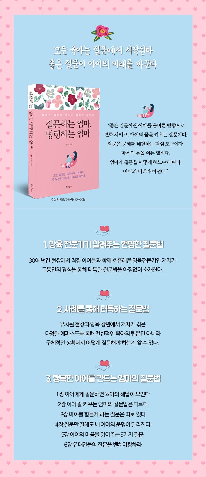 ¾Æ¹«¸® ÇÏÂúÀº Áú¹®ÀÌ¶óµµ ¾ÆÀ̵éÀº ÁýÁßÇϰí, ÀÌ °úÁ¤À» ÅëÇØ ¾ÆÀÌ ¶ÇÇÑ ½º½º·Î Áú¹®ÇÏ´Â ¾ÆÀ̰¡ µÈ´Ù. À̶§ ¾ö¸¶´Â Áú¹® ¼Ó¿¡ °¨µ¿°ú ÁöÇý¸¦ ³Ö¾îÁÖ¾î¾ß ÇÑ´Ù. ±×·¯¸é âÀÇÀûÀÎ ¾ÆÀ̰¡ µÉ ¼ö ÀÖ´Â °ÍÀº ¹°·ÐÀ̰í, ±Ã±ØÀûÀ¸·Î ½º½º·Î °áÁ¤À» ³»¸®°Ô µÇ°í ¿Ã¹Ù¸¥ ÇൿÀ» ÇÏ°Ô µÈ´Ù. Áï ¾ö¸¶ÀÇ Áú¹®ÀÌ ¾ÆÀ̸¦ ¹Ù²Ü ¼ö ÀÖ´Â °ÍÀÌ´Ù. ¾ÆÀÌ¿ÍÀÇ ½Ö¹æÇâ Áú¹®ÀÌ ¼º°øÇÏ·Á¸é ¾ÆÀÌ¿¡°Ô Áú¹®À» ´øÁö´Â ¹æ½ÄÀÌ ¸Å¿ì Áß¿äÇÏ´Ù. ¸ÕÀú ¾ó±¼À» ¸¶ÁÖÇÏ°í ´«À» º¸¸ç Á÷Á¢ÀûÀ¸·Î »óÈ£ÀÛ¿ëÇÏ´Â °ÍÀÌ ÁÁ´Ù. ¾ö¸¶´Â ³¯Ä«·Î¿î Áú¹®À» ÇØ¾ß ÇÒ ¶§¿Í °Ý·ÁÇϰí ÁöÁöÇØÁÖ¾î¾ß ÇÒ ¶§¸¦ ¾Ë·ÁÁÖ´Â ¸öÁþ ¾ð¾îÀÇ ¹Ì¹¦ÇÑ ½ÅÈ£µéÀ» Æ÷ÂøÇÒ ÁÙ ¾Ë¾Æ¾ß ÇÑ´Ù. ¾ö¸¶ÀÇ Áú¹®Àº ±Ã±ÝÇÑ ¾î´À ÇÑ ºÎºÐ¿¡ Ä¡¿ìÄ¡°Å³ª ÇÑÁ¤µÇÁö ¾Ê¾Æ¾ß ÇÑ´Ù. ´õ±º´Ù³ª µ¶´ÜÀûÀÎ Áú¹®À¸·Î ¾ÆÀ̸¦ ½É¹®ÇÏ°Ô µÇ¸é ¾ÆÀÌ´Â ´õÀÌ»ó ¾ö¸¶ÀÇ ¸»À» µèÁö ¾Ê´Â, Áï °æÃ»ÇÏÁö ¸øÇÏ´Â ¾ÆÀ̰¡ µÇ°í ÀÚ±â ÇÏ°í ½ÍÀº ¸»¸¸ ÇÏ´Â ¾ÆÀ̰¡ µÈ´Ù´Â °ÍÀ» ¸í½ÉÇØ¾ß ÇÑ´Ù. _p.37