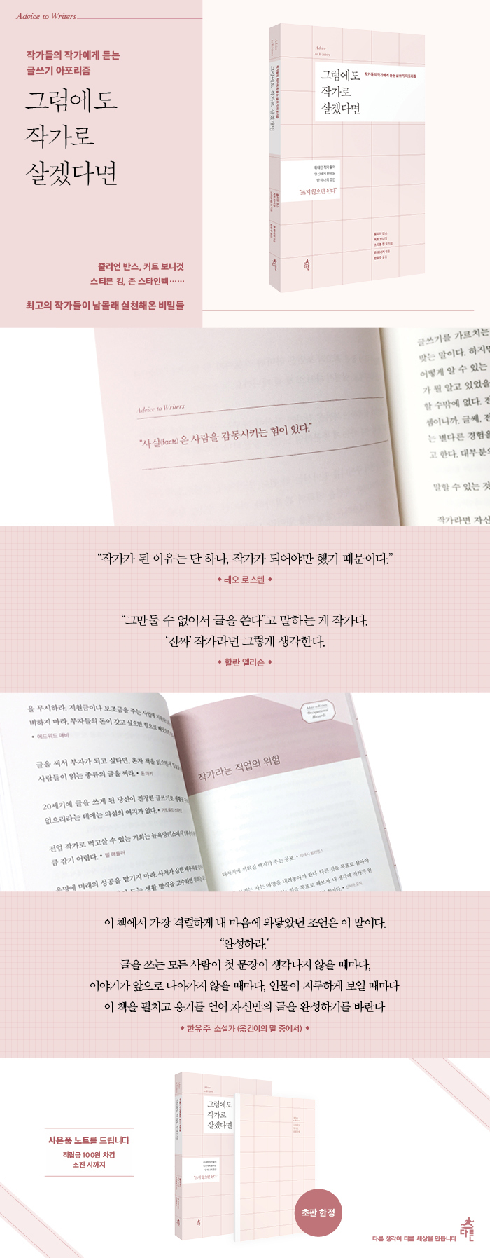 ij¸¯Åͳª Ç÷ÔÀ» Â¥´Â ¹ý¿¡¼ºÎÅÍ, Ç¥Àý°ú µ¶¼, ¼úÀÌ Ã¢ÀÛ È°µ¿¿¡ ³¢Ä¡´Â ¿µÇâ, ¹®ÇлóÀÇ ºû°ú ±×¸²ÀÚ, ÆíÁýÀÚ ´Ù·ç´Â ¹ý, µ¿·á ÀÛ°¡¿ÍÀÇ Àΰ£°ü°è, ±Û¾²±â¿¡ ´ëÇØ ¿ì¸®°¡ ½À°üÀûÀ¸·Î ǰ´Â ȯ»ó¿¡ À̸£±â±îÁö ±Û¾²±â¿¡ °üÇÑ Æø³ÐÀº Á¶¾ðÀ» µéÀ» ¼ö ÀÖ´Ù. ±ÛÀ» ¾²´Â »ç¶÷À̶ó¸é ÇѹøÂë »ý°¢Çغ¸¾Æ¾ß Çϰųª, ¾ðÁ¨°¡ ºÎµúÈ÷°Ô µÉ ¹®Á¦¿¡ °üÇØ ¼±¹è ÀÛ°¡µéÀÌ ´øÁö´Â »À ÀÖ´Â ÇѸ¶µð, ÀçÄ¡ ³ÑÄ¡´Â Ãæ°í, »ì¾Æ ÀÖ´Â ÁöÇý, ³²¸ô·¡ ½ÇÃµÇØ¿Â ºñ¹ÐÀÌ °¡µæÇÏ´Ù. - MD Ãßõ