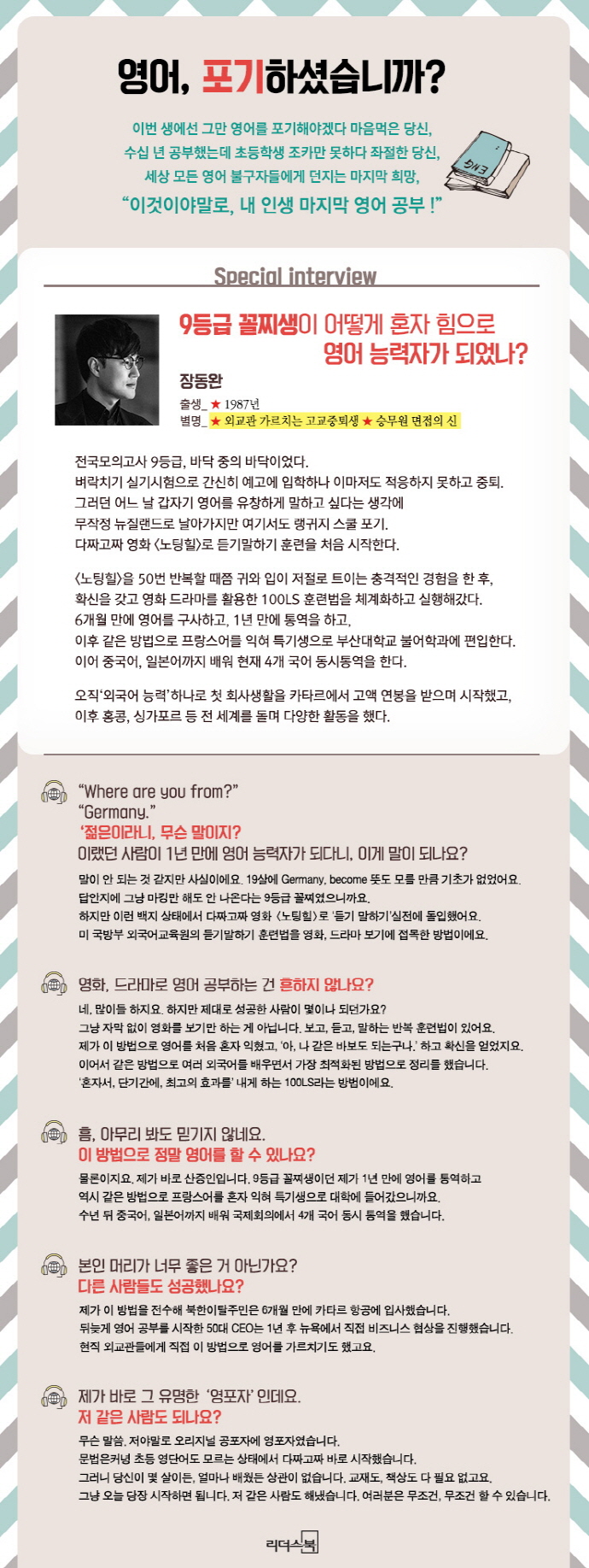 Àú´Â Á¤±Ô ±³À°À» Á¦´ë·Î ¹ÞÁö ¸øÇß°í, ³²µéó·³ Çб³»ýȰ¿¡ ÀûÀÀÇÏÁöµµ ¸øÇß½À´Ï´Ù. ±×·¡¼ ¼¼»óÀ» ¾Ë±â À§ÇØ ¼ö¸¹Àº ±æÀ» È¥ÀÚ °ÉÀ¸¸ç ½ÃÇàÂø¿À¸¦ °Þ¾î¾ß Çß½À´Ï´Ù. ÇÏÁö¸¸ ÈÄȸ´Â ¾ø½À´Ï´Ù. ±× ³ë·ÂÀÇ ½Ã°£µéÀÌ Á¦ »îÀ» ¹Ù²ã³õ¾Ò±â ¶§¹®ÀÔ´Ï´Ù. ´Ù¾çÇÑ ¿Ü±¹¾î¸¦ ±¸»çÇÒ¼ö·Ï, ´Ù¾çÇÑ ±¹ÀûÀÇ ¿Ü±¹Àεé°ú ÇÔ²²ÇÒ¼ö·Ï Á¦°¡ »ì¾Æ°¥ ¼ö ÀÖ´Â ¼¼»óÀÌ ±×¸¸Å ³Ð¾îÁø´Ù´Â °É Áø½ÉÀ¸·Î °¡½¿ ±íÀÌ ±ú´Ý°í Àֱ⠶§¹®ÀÔ´Ï´Ù.