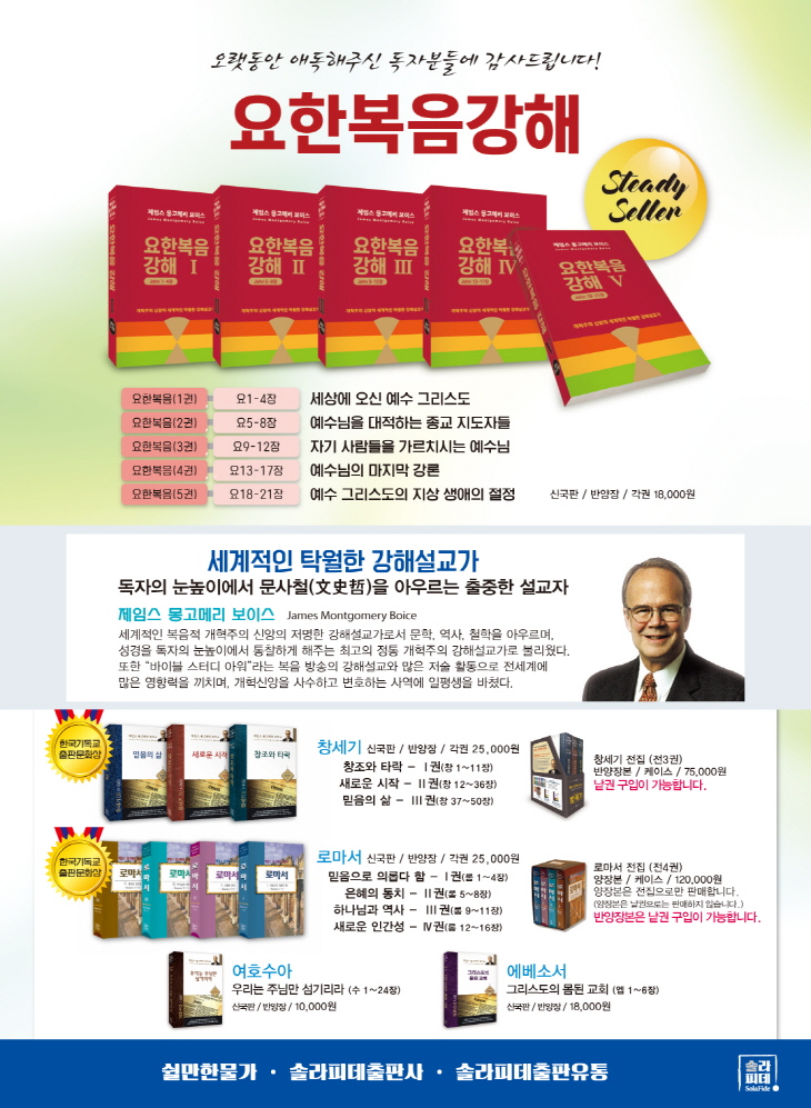 ÀÌÁ¦´Â õ±¹¿¡ °è½Ã´Â º¸À̽º ¸ñ»ç´ÔÀÇ °­Çؼ³±³Áý °¡¿îµ¥ â¼¼±â °­ÇØ´Â ÀÌ¹Ì ¹Ì±¹¿¡¼­´Â ¸¹ÀÌ ¾Ë·ÁÁø °­Çؼ­ÀÌ´Ù. ÀÌ ±ÍÇÑ °­Çؼ­°¡ Ãâ°£ÀÌ µÇ¾î ¾öû³­ ±â»ÝÀÌ »ý±ä´Ù. Á¦ÀÓ½º ¸ù°í¸Þ¸® º¸À̽ºÀÇ Ã¶ÀúÇÑ °³ÇõÁÖÀÇÀû °üÁ¡À¸·Î ÁÖ¼®°ú ÁÖÇØ µî¿¡ À־ Ź¿ùÇÑ ¼³±³¸¦ ÇϽô ºÐÀÌ´Ù. Çѱ¹±³È¸¿¡´Â ÀÌ·¯ÇÑ ¼³±³ÀÚ°¡ ¾ø´Ù´Â °ÍÀÌ ³Ê¹«³ª ¾ÈŸ±õ´Ù. ¸ñȸÀÚµé°ú ½ÅÇлýµéÀº ²À Àб⸦ °­·ÂÈ÷ ±ÇÇÑ´Ù.