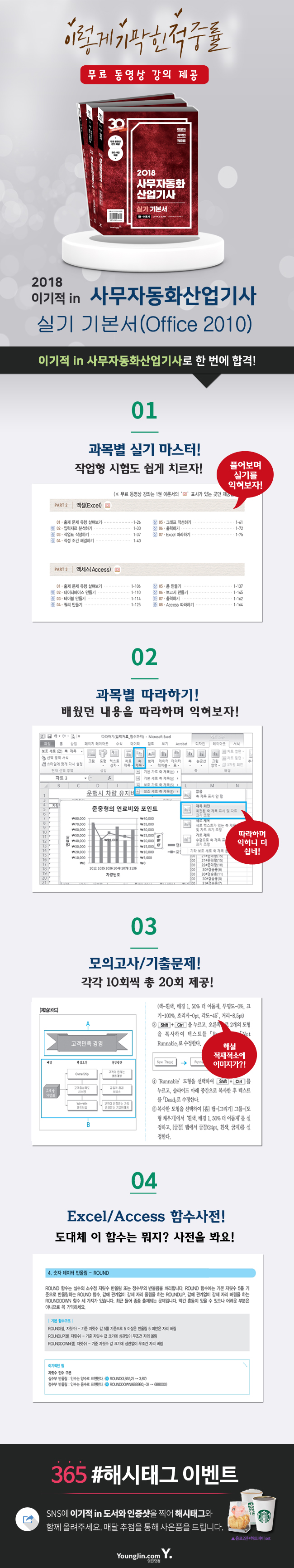 º» µµ¼´Â »ç¹«ÀÚµ¿È»ê¾÷±â»ç ½Ç±â½ÃÇèÀ» ÁغñÇÏ´Â ¼öÇè»ýµéÀÌ È¥ÀÚ¼µµ ½ÃÇè Áغñ¸¦ ÇÒ ¼ö ÀÖµµ·Ï ÇÑ ¿Ïº® ´ëºñ¼ÀÔ´Ï´Ù. ¿ÀÇǽº 2010 ¹öÀüÀ¸·Î ÇнÀÇÒ ¼ö ÀÖµµ·Ï ÀÛ¼ºµÇ¾úÀ¸¸ç, ÀÛ¾÷Çü ½ÃÇè¿¡ µû¸¥ ÀÚ¼¼ÇÑ ¼³¸í°ú ´Ù¾çÇÑ ¹®Á¦ À¯ÇüÀ» ½Æ°í ÀÖ½À´Ï´Ù. ½ÃÇè °ú¸ñÀÎ ¿¢¼¿, ¾×¼¼½º, ÆÄ¿öÆ÷ÀÎÆ®¿¡ °üÇÑ À̷аú ÇÔ²² µû¶óÇϱ⸦ ÅëÇØ ½ÃÇè À¯ÇüÀ» ÀÍÈú ¼ö ÀÖµµ·Ï ÇÏ¿´°í, À̷аú µû¶óÇϱâÀÇ ¹«·á µ¿¿µ»óµµ Á¦°øÇÕ´Ï´Ù. ¸ðÀǰí»ç 10ȸ ¹× ÃֽбâÃâ¹®Á¦ 10ȸ¸¦ Á¦°øÇÏ¿© ¼öÇè»ý ¿©·¯ºÐµé²²¼´Â ÃæºÐÇÑ ÇнÀ ¹× ´ëºñ¸¦ ÇÏ½Ç ¼ö ÀÖ½À´Ï´Ù. ´õÇÏ¿© ÇнÀ ½Ã ¾î·Á¿ï ¼ö ÀÖ´Â ÇÔ¼ö»çÀüµµ º°Ã¥À¸·Î ±¸¼ºÇÏ¿´½À´Ï´Ù.