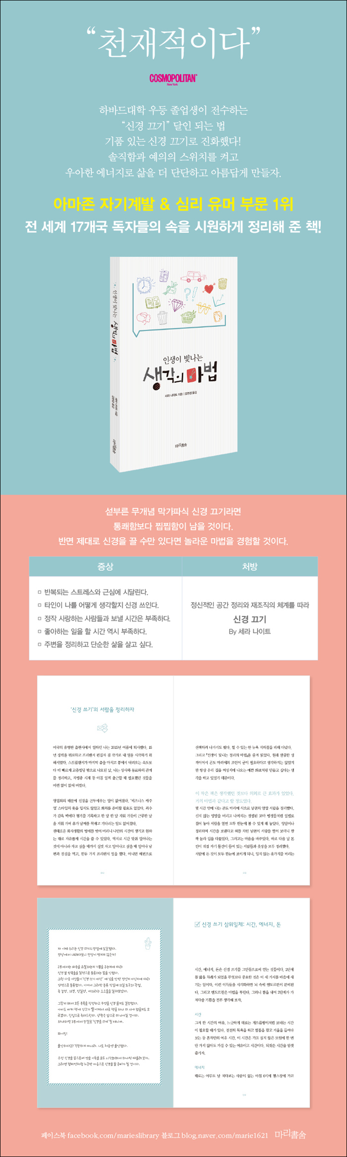 P.21 : ³ª´Â ÀλýÀ» ºû³ª°Ô ÇÏ´Â ¸¶¹ýÀÌ ³» ¾È¿¡ ÀÖÀ½À» ±ú´Þ¾Ò´Ù. Àڽſ¡°Ô ±â»ÝÀ» ÁÖ´Â ÀÏÀΰ¡? ±×·¸´Ù¸é ¹«½¼ ÀÏÀÌ ÀÖ´õ¶óµµ °è¼Ó ½Å°æÀ» ¾²¸é µÈ´Ù. ÇÏÁö¸¸ ±ÍÂúÀº ÀÏÀΰ¡? ÇÏ°í ½ÍÁö ¾ÊÀº ÀÏÀε¥ ¾ïÁö·Î ÇÏ·Á°í Çϴ°¡? ±×·¸´Ù¸é °¡±ÞÀû »¡¸® ½Å°æÀ» ²¨¾ß ÇÑ´Ù. ³ª´Â ½Å°æ ¾²Áö ¾ÊÀ½À¸·Î½á ¡®Á¤½ÅÀûÀΡ¯ °ø°£À» Á¤¸®Çϰí ÀçÁ¶Á÷Çϴ ü°è¸¦ »ý°¢Çس´Ù. ¿©±â¼ ¡®½Å°æ ²ô±â¡¯¶õ Çູ°¨À» ÁÖÁö ¾Ê°Å³ª °³¼±µÇÁö ¾Ê´Â ±ÍÂúÀº ÀÏ, ±×¸®°í ±×¸® Áß¿äÇÏÁö ¾ÊÀº ÀÏ¿¡ ½Ã°£°ú ¿¡³ÊÁö, µ·À» ¾²Áö ¾Ê´Â °É ÀǹÌÇÑ´Ù. ÇÏÂúÀº ÀÏ¿¡ ½Å°æÀ» ²ô¸é ±â»ÝÀ» ÁÖ´Â ÀÏ¿¡ Àü³äÇÒ ½Ã°£°ú ¿¡³ÊÁö, µ·À» ´õ ¸¹ÀÌ È®º¸ÇÏ°Ô µÈ´Ù.