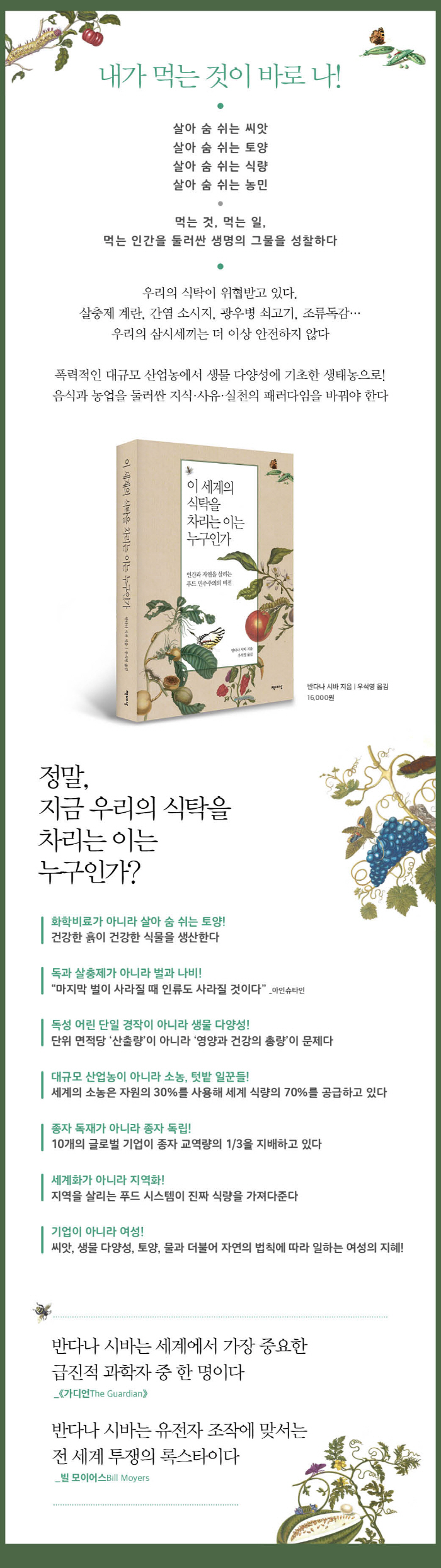 ¡°Áö±Ý ¿ì¸®¿¡°Ô ÇÊ¿äÇÑ °Ç ÆÐ·¯´ÙÀÓ Àüȯ, ±Ç·Â ÀüȯÀÌ´Ù. ±â¾÷ÀÇ Å½¿åÀÌ ¸¸µé¾î³½ »ê¾÷³óÀº ¿ì¸®¿¡°Ô Áö¼Ó °¡´É¼º°ú °Ç°À» º¸ÀåÇÏÁö ¾ÊÀ¸¸ç, º¸ÀåÇÒ ¼öµµ ¾ø´Ù. ¹Ý¸é ¿ì¸®´Â ³ó»ýÅÂÇÐÀ¸·Î ÀüȯÇÒ ¼ö´Â ÀÖ´Ù. Á¾ÀÚ¸¦ º¸Á¸Çϰí Åä¾ç¿¡ »ý¸íÀ» µÇµ¹·ÁÁÖ°í »ý¹° ´Ù¾ç¼ºÀ» ´õ¿í´õ dz¿ä·Ó°Ô ¸¸µé°í ¼Ò³ó°ú ¿©¼ºµéÀ» º¸È£ÇÔÀ¸·Î½á, ¿ì¸®´Â ½º½º·ÎÀÇ ÈûÀ¸·Î ¿ì¸®ÀÇ ½ÄŹÀ» dz¼ºÇÏ°Ô Â÷¸± ¼ö ÀÖ´Ù. ¿ì¸®ÀÇ ¾Æ¸§´Ù¿î Áö±¸¸¦ ±ÃÇÌÇÑ Áö±¸·Î ¸¸µå´Â Ȱµ¿À» ÀÌÁ¦´Â ¸ØÃç¾ß¸¸ ÇÑ´Ù. Èñ¸ÁÀÇ ¾¾¾ÑÀ» »Ñ¸± ¼ö ÀÖ´ÂÁö ¾Æ´ÑÁö´Â ¼øÀüÈ÷ ¿ì¸® ¼Õ¿¡ ´Þ·Á ÀÖ´Ù. Áö±¸¿Í Áö±¸¿¡ »ç´Â ¸ðµç »ç¶÷µéÀÇ °Ç°°ú ¾È³çÀ» À§ÇØ ÀÛµ¿Çϴ Ǫµå ½Ã½ºÅÛÀ» À§ÇÑ Èñ¸ÁÀÇ ¾¾¾Ñ ¸»ÀÌ´Ù.¡±