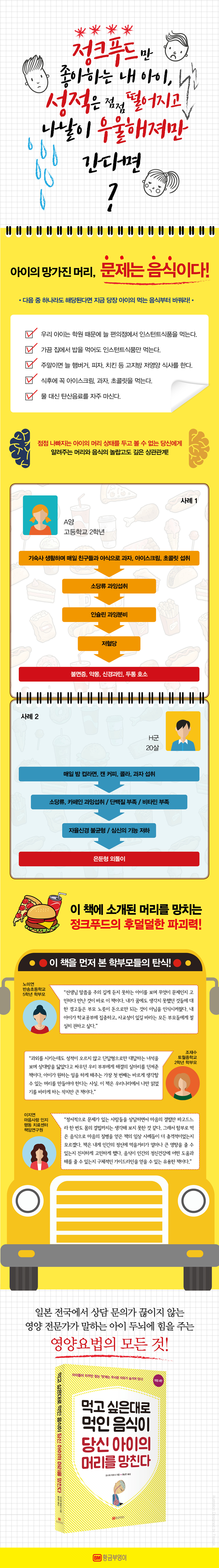 ¡®Áý¹äÀÇ Èû¡¯À̶óµçÁö ¡®¹ä»ó¸Ó¸® ±âÀû¡¯ °°Àº À̾߱âµéÀÌ ¾ð·Ð¿¡ ³ëÃâµÇ¸é¼ Áý¿¡¼ Á¦´ë·Î ¸ÔÀÌ´Â °ÍÀÌ Áß¿äÇϱ¸³ª ÇÏ´Â ¸·¿¬ÇÑ ÀǽÄÀº ÀÖÁö¸¸ ½ÇõÀ¸·Î ½±°Ô À̾îÁöÁö´Â ¾Ê´Â´Ù. ¿µ¾çÀÌ µÎ³ú¿¡ ¹ÌÄ¡´Â Á÷Á¢ÀûÀÎ ¿µÇâ¿¡ ´ëÇØ¼ Á¦´ë·Î ¾ËÁö ¸øÇϱ⠶§¹®ÀÌ´Ù. ½Ã°£¿¡ Âѱâ°í Èû¿¡ ºÎÄ¡Áö¸¸ ±×·¡µµ ±¾±â´Â °Íº¸´Ù´Â ¸ÔÀÌ´Â °Ô ³ªÀ» °Í °°¾Æ¼ »ç ÁØ À½½ÄÀÌ ³» ¾ÆÀÌÀÇ ¸Ó¸®¸¦ º´µé°Ô Çϰí ÀÖ´Ù¸é? ±×·¡¼ °¥¼ö·Ï Â¥ÁõÀÌ ¸¹°í ³ÆøÇÑ ¾ÆÀÌ·Î º¯Çϰí ÀÖ´Ù¸é? ÀÌ Ã¥Àº ÆÐ½ºÆ®Çªµå¿Í ÀνºÅÏÆ®½Äǰ µî Á¤Å©Çªµå°¡ ¾ó¸¶³ª Á¶¾ÇÇÏ°Ô ¿ì¸® ¾ÆÀÌÀÇ ¸Ó¸®¸¦ ¸ÁÄ¡´ÂÁö ³¹³¹ÀÌ ÆÄÇìÄ£´Ù. ¶ÇÇÑ ¿µ¾ç¿ä¹ýÀ¸·Î ¾ÆÀÌÀÇ µÎ³ú °Ç°À» ȸº¹ÇÑ ½ÇÁ¦ »ç·Ê¸¦ ÅëÇØ °Ç°ÇÏ°í ¶È¶ÈÇÏ°Ô ¾ÆÀ̸¦ Ű¿ì·Á¸é ºÎ¸ð°¡ ¹Ýµå½Ã ¾Ë¾Æ¾ß ÇÒ Çʼö °Ç°»ó½ÄÀ» ´ã¾Ò´Ù.