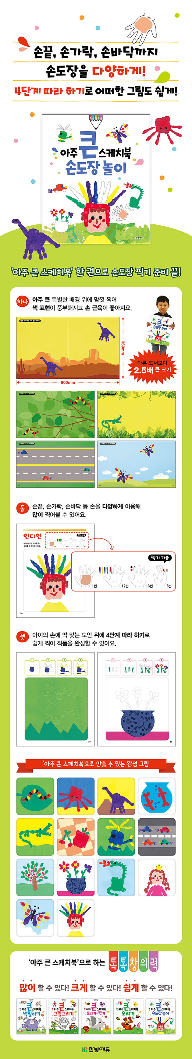 ¼ÕÀº Á¦2ÀÇ µÎ³ú¶ó°í ÇÏÁÒ. <¾ÆÁÖ Å« ½ºÄÉÄ¡ºÏ> ÇÑ ±ÇÀÌ¸é ¼Õ³¡ºÎÅÍ ¼Õ°¡¶ô, ¼Õ¹Ù´Ú±îÁö µµÀå Âï´Â Ȱµ¿À» ÅëÇØ ¼Ò±ÙÀ°À» ¹ß´Þ½Ãų ¼ö ÀÖ¾î¿ä. ±×¸®°í ¹°°¨À» Á÷Á¢ Â¥ º¸°í ¼¯¾î º¸°í ¹ß¶ó º¸´Â Ȱµ¿À» ÅëÇØ »ö Ç¥Çöµµ dzºÎÇØÁý´Ï´Ù. Ã¥¿¡¼ Á¦°øÇÏ´Â Âï±â ±â¼úÀ» ÅëÇØ µµÀå Âï±â¿¡ »ç¿ëÇÒ ¼Õ ºÎÀ§¿Í »öÀ» È®ÀÎÇÑ ÈÄ ¾ÆÀÌÀÇ ¼Õ Å©±â¿¡ ¸Â°Ô Á¦°øÇÏ´Â Á¡¼± µµ¾È À§¿¡ ²Ú Âï¾î º¸¼¼¿ä. 4´Ü°è µû¶ó Çϱâ·Î Âï´Â ¼ø¼µµ ¾Ë·ÁÁÖ°í ÀÖ¾î ½±°Ô ¸ÚÁø ±×¸²À» ¿Ï¼ºÇÒ ¼ö ÀÖ½À´Ï´Ù.