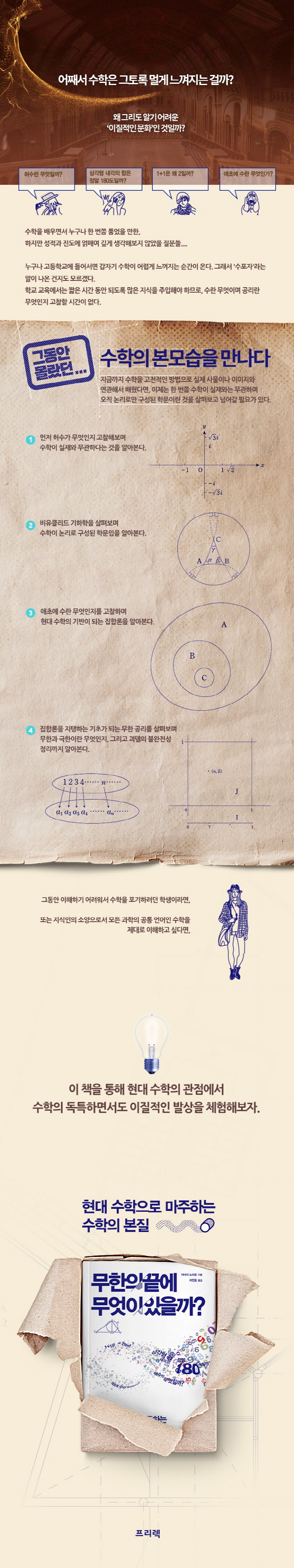 Áö±Ý±îÁö ¼öÇÐÀ» °íÀüÀûÀÎ ¹æ¹ýÀ¸·Î ½ÇÁ¦ »ç¹°À̳ª À̹ÌÁö¿Í ¿¬°üÇØ¼ ¹è¿ü´Ù¸é, ÀÌÁ¦´Â ÇÑ ¹øÂë Çö´ë ¼öÇÐÀÇ °üÁ¡¿¡¼ ¼öÇÐÀÌ ½ÇÀç¿Í´Â ¹«°üÇÏ¸ç ¿ÀÁ÷ ³í¸®·Î¸¸ ±¸¼ºµÈ Çй®À̶õ °ÍÀ» »ìÆìº¸°í ³Ñ¾î°¥ Çʿ䰡 ÀÖ´Ù. ÀÌ Ã¥¿¡¼´Â ¼öÇÐÀ̶ó´Â ÀÌÁúÀûÀÎ ¹®ÈÀÇ º®À» ³ÑÀ» ¼ö ÀÖµµ·Ï, ´©±¸³ª ÇÑ ¹øÂë ±Ã±ÝÇßÀ» ¸¸ÇÑ ÈÁ¦¸¦ ÅëÇØ ¼öÇÐÀÇ ¼¼°è°üÀ» Ç®¾î³ª°£´Ù. Á¦°öÇϸé À½¼ö°¡ µÇ´Â ¡®Çã¼ö¡¯, ºñÀ¯Å¬¸®µå ±âÇÏÇÐ, ³í¸®¿Í ÁýÇÕ, ¹«ÇÑ, ±«µ¨ÀÇ ºÒ¿ÏÀü¼º Á¤¸® µî ³ÇØÇÑ °³³äµµ ¾Ë±â ½±°Ô ¼³¸íÇÑ´Ù. ÀÌ Ã¥À» ÀÐ°í ³ª¸é ÇÑ ¹øÂë ¼öÇÐÀÚ¸¦ ²Þ²Ù´Â ÀÚ½ÅÀ» ¹ß°ßÇÒÁöµµ ¸ð¸£°Ú´Ù.