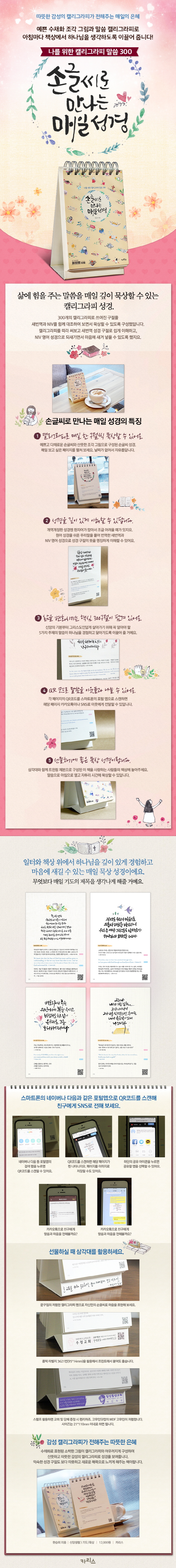 »î¿¡ ÈûÀ» ÁÖ´Â ¸»¾¸À» ¸ÅÀÏ ±íÀÌ ¹¬»óÇÒ ¼ö Àִ Ķ¸®±×¶óÇÇ ¼º°æ. 300°³ÀÇ Ä¶¸®±×¶óÇÇ·Î ¾²¿©Áø ±¸ÀýÀ» »õ¹ø¿ª°ú NIV¸¦ ÇÔ²² ´ëÁ¶ÇÏ¿© º¸¸é¼ ¹¬»óÇÒ ¼ö ÀÖµµ·Ï ±¸¼ºÇß´Ù. ͏®±×¶óÇǸ¦ µû¶ó ½áº¸°í »õ¹ø¿ª ±¸Àý·Î ½±°Ô ÀÌÇØÇϰí, NIV ¿µ¾î ¼º°æÀ¸·Î µÇ»õ±â¸é¼ ¸¶À½¿¡ »õ°Ü ³ÖÀ» ¼ö ÀÖµµ·Ï Çß´Ù. ¸¶À½ °¡´Â ´ë·Î ÇÏ·çÇÏ·ç ÆäÀÌÁö¸¦ ³Ñ±â´Ùº¸¸é ³¯¸¶´Ù ´Ù¸¥ ÁÖÁ¦·Î ÃÎÃÎÈ÷ Â¥ÀÎ ¸»¾¸µéÀÌ µ¶ÀÚµéÀÇ °¡Á¤°ú ÀÏÅÍÀÇ Ã¥»ó À§¿¡¼ Çϳª´ÔÀ» ±íÀÌ ÀÖ°Ô °æÇèÇϵµ·Ï µµ¿ï °ÍÀÌ´Ù. ¶ÇÇÑ º»¹®ÀÇ QR Äڵ带 Ȱ¿ëÇØ SNS·Î ÀÌ¿ôµé°ú ³ª´ ¼ö ÀÖ°í, ¼±¹°Çϱ⿡µµ ¿¹»Û Ã¥ÀÌ´Ù.
