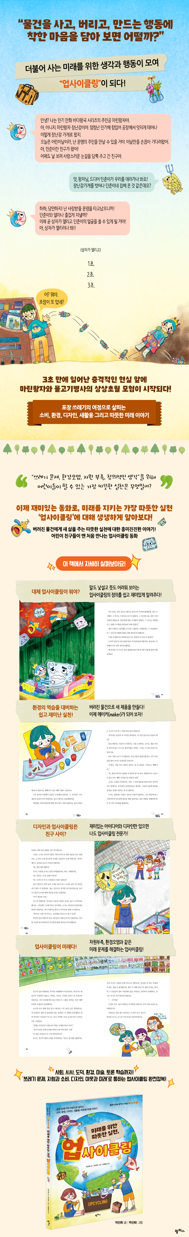 ¡¶¹Ì·¡¸¦ À§ÇÑ µû¶æÇÑ ½Çõ, ¾÷»çÀÌŬ¸µ¡·Àº »ýȰ ¼Ó Æ÷ÀåÀçµéÀÇ µå¶ó¸¶Æ½ÇÑ ¿©Á¤À» ÅëÇØ ¹°°ÇÀÇ ¼Òºñ¿Í ¾²·¹±â ¹®Á¦¿¡ ´ëÇÑ °æÁ¾À» ¿ï¸®°í, ¹ö·ÁÁø ¹°°ÇÀ» Àçź»ý½ÃŰ´Â ÇൿÀÎ ¡®¾÷»çÀÌŬ¸µ¡¯¿¡ ´ëÇØ À̾߱âÇÑ´Ù. âÀÇÀûÀÎ ¾ÆÀ̵ð¾î·Î ¹ö·ÁÁø ¹°°Ç¿¡ »õ·Î¿î °¡Ä¡¸¦ ºÎ¿©ÇÏ´Â ¡®¾÷»çÀÌŬ¸µ¡¯Àº ³ª¿Í ÀÌ¿ô, ´õ ³ª¾Æ°¡ Áö±¸¿Í ¹Ì·¡¸¦ ÁöŰ´Â ½ÇõÀÌ´Ù. ¿ì¸®ÀÇ ¼±Åÿ¡ µû¶ó Á¤¹Ý´ëÀÇ ¿©Á¤À» ¶°³ª°Ô µÇ´Â ¸¶¸°¿ÕÀÚ¿Í ¹°°í±âº´»çÀÇ À̾߱â´Â ¾î¸°À̵鿡°Ô ¡®¹°°ÇÀÇ »ý¾Ö¡¯¿¡ ´ëÇÑ »ý°¢°Å¸®¸¦ ´øÁ®ÁØ´Ù. ¶ÇÇÑ ¾î¸°ÀÌ Ä£±¸µéµµ âÀÇÀûÀÎ ¾ÆÀ̵ð¾î¸¸ ÀÖÀ¸¸é ¾ó¸¶µçÁö ¹ö·ÁÁø ¹°°ÇÀ¸·Îµµ ¸ÚÁø ¹°°ÇÀ» ¸¸µé ¼ö ÀÖÀ½À» ¾Ë·ÁÁØ´Ù. ³ª, ÀÌ¿ô, ȯ°æ°ú ¹Ì·¡¸¦ »ý°¢Çϰí, ¡®¸¸µå´Â Àç¹Ì¡¯¸¦ Àϱú¿öÁÖ´Â Èï¹ÌÁøÁøÇÑ ¡®¾÷»çÀÌŬ¸µ¡¯ÀÇ ¼¼°è·Î ¾È³»ÇÑ´Ù.