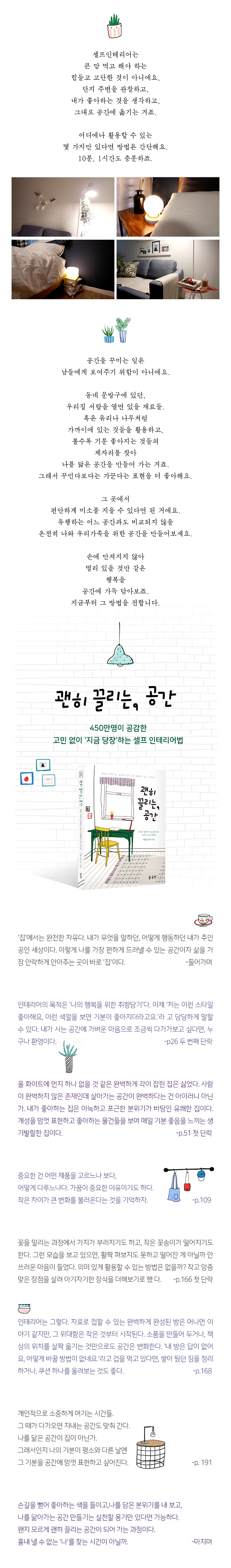 ÀÎÅ׸®¾î´Â ±×·¸´Ù. ÀÚ·á·Î Á¢ÇÒ ¼ö ÀÖ´Â ¿Ïº®ÇÏ°Ô ¿Ï¼ºµÈ ¹æÀº ¸Ó³ª¸Õ À̾߱⠰°Áö¸¸, ±× À§´ëÇÔÀº ÀÛÀº °ÍºÎÅÍ ½ÃÀ۵ȴÙ. ¼ÒǰÀ» ¸¸µé¾î µÎ°Å³ª, Ã¥»óÀÇ À§Ä¡¸¦ »ì¦ ¿Å±â´Â °Í¸¸À¸·Îµµ °ø°£Àº º¯ÈÇÑ´Ù. '³» ¹æÀº ´äÀÌ ¾ø¾î¿ä, ¾î¶»°Ô ¹Ù²Ü ¹æ¹ýÀÌ ¾ø³×¿ä.'¶ó°í °ÌÀ» ¸Ô°í ÀÖ´Ù¸é, ½×¾Æ µ×´ø ÁüÀ» Á¤¸®Çϰųª, Äí¼Ç Çϳª¸¦ ¿Ã·Áº¸´Â °Íµµ ÁÁ´Ù. -p.168