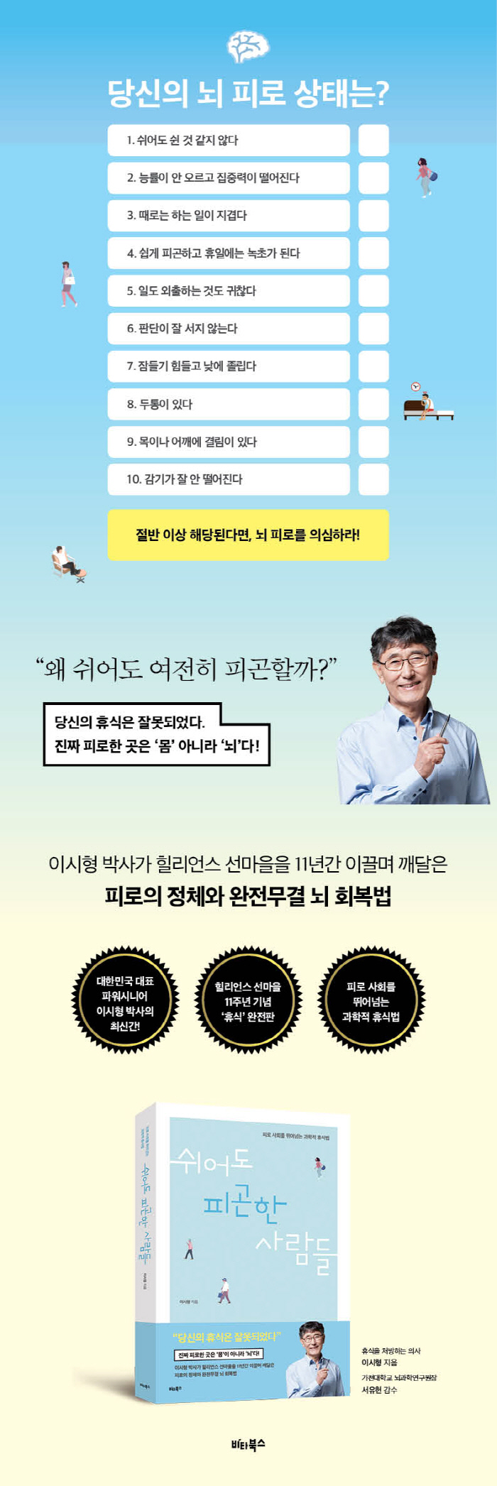 ¡°½¬¾îµµ ½® °Í °°Áö°¡ ¾Ê¾Æ¿ä.¡± ¡°¹Ù»Úµç ¾È ¹Ù»Úµç ´Ã ÇǰïÇØ¿ä.¡± ¡°ÁýÁßÀÌ ¾È µÇ°í Àâ»ý°¢ÀÌ ¸¹¾ÆÁ³¾î¿ä.¡± Çö´ëÀÎÀÌ ´Ã ÀÔ¿¡ ´Þ°í »ç´Â ¸»ÀÌ´Ù. Á¤½Å°ú ÀÇ»çÀÌÀÚ ³ú °úÇÐÀÚÀÎ À̽ÃÇü ¹Ú»ç´Â ±× ÀÌÀ¯°¡ ¡®³ú ÇǷΡ¯ ¶§¹®À̶ó°í ¸»ÇÑ´Ù. »ç¶÷µéÀº ÈçÈ÷ ¸ö¸¸ ½¬¸é ¸ðµç ÇǷΰ¡ ȸº¹µÇ´Â ÁÙ ¾ËÁö¸¸ õ¸¸ÀÇ ¸»¾¸, ³ú ÇǷδ ¸öÀ» ½®´Ù°í Ç®¸®Áö ¾Ê´Â´Ù. ¿ÀÈ÷·Á ÇǷθ¦ µ¤¾î¹ö¸²À¸·Î½á Àº¹ÐÈ÷ ÇǷθ¦ °¡Áß½Ãų »ÓÀÌ´Ù. ÀÌ Ã¥Àº Çö´ëÀÎÀÌ ³ú ÇǷθ¦ Ç®°í ÁøÁ¤ÇÑ ÈÞ½ÄÀÇ ±æ·Î ³ª¾Æ°¥ ¼ö ÀÖµµ·Ï µ½´Â´Ù.