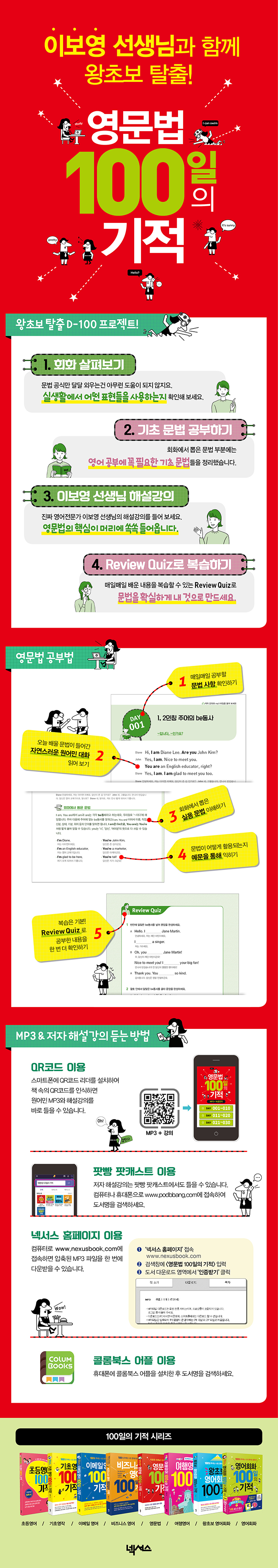 <¿µ¹®¹ý 100ÀÏÀÇ ±âÀû>Àº ´Ü¼øÈ÷ ¹®¹ý ±ÔÄ¢À» Á¦½ÃÇÏ´Â °Í¿¡¼ ¹þ¾î³ª °¢°¢ÀÇ ¹®¹ýµéÀÌ ½ÇÁ¦ ȸȿ¡¼ ¾î¶² ¸Æ¶ôÀ¸·Î, ¾î¶² ¸ð¾çÀ¸·Î ¾²ÀÌ´ÂÁö¸¦ ¾Ë ¼ö ÀÖ°Ô ÇÏ´Â °ÍÀ» ¸ñÇ¥·Î Ç߱⠶§¹®¿¡ ¾î·Á¿î ¹®¹ý ¿ë¾î³ª ½Ç»ýȰ¿¡¼ ¾²ÀÌÁö ¾Ê´Â ¿¹¹®Àº ´Ù·çÁö ¾Ê¾Ò½À´Ï´Ù.