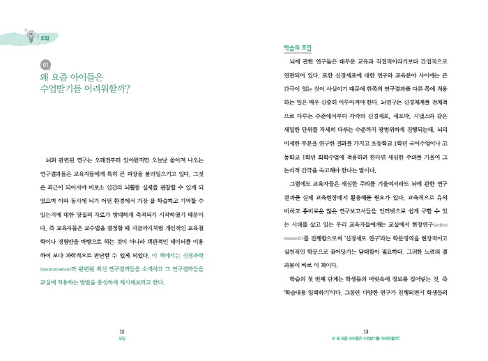 ¡ß ¿À´Ã³¯ ÇлýµéÀÇ ÁÖÀÇÁýÁß ½Ã°£Àº ¿¹Àü¿¡ ºñÇØ ºÐ¸íÈ÷ ª¾ÆÁ³´Ù. ÀÌÀ¯´Â ¹«¾ùÀϱî? Çö´ë»çȸ´Â µðÁöÅбâ±â°¡ º¸ÆíȵǾî ÀÖ°í, ¾ÆÀ̵éÀº °ÔÀÓ ¹× ¹Ìµð¾î¿¡ ½±°Ô ³ëÃâµÇ´Â ȯ°æ¿¡¼ ÀÚ¶õ´Ù. ÀÌ·± ȯ°æ ¶§¹®¿¡ ¿äÁò ¾ÆÀ̵éÀº Áï°¢ÀûÀÌ°í °·ÄÇÑ ÀÚ±ØÀ» ¼±È£Çϰí, ª°í ´Ü¼øÇÑ À̾߱⿡ Àͼ÷ÇÏ´Ù. ¾ÆÀ̵éÀÌ ¼ÒºñÇÏ´Â ¿Â¶óÀΰÔÀÓÀ̳ª ¿¹´ÉÇÁ·Î±×·¥ÀÇ Àڱؼº, ÀÎÅͳݿ¡¼ À¯ÇàÇÏ´Â µ¿¿µ»óÀ» »ý°¢Çغ¸¸é ½±°Ô ÀÌÇØµÉ °ÍÀÌ´Ù. ¶ÇÇÑ ³ú°úÇÐ ¿¬±¸¿¡¼ ¹àÇôÁø ¡®³ú °¡¼Ò¼º(brain plasticity)¡¯ ÀÌ·Ð, Áï ³ú´Â ȯ°æ¿¡ ¹ÝÀÀÇÏ¸ç º¯ÈÇÑ´Ù´Â °³³äÀÌ À̸¦ ÁöÁöÇÑ´Ù. ±×·¯¹Ç·Î ±â¼º¼¼´ëÀÎ ±³»ç°¡ ¿äÁò ¾ÆÀ̵éÀ» Á¦´ë·Î ÀÌÇØÇÏ°í ¿Ã¹Ù·Î À̲ø¾î°¡·Á¸é ³úÀÇ Æ¯¼º ¹× ÀÛ¿ë¿¡ ´ëÇÑ ³ú°úÇÐÀÇ ¿¬±¸°á°ú¸¦ À¯½ÉÈ÷ »ìÆìº¼ Çʿ䰡 ÀÖ´Ù. ÀÌ Ã¥Àº ³ú°úÇÐÀû ¿¬±¸°á°ú¸¦ dzºÎÇÏ°Ô Á¦½ÃÇÏ¸é¼ À̰ÍÀ» Ȱ¿ëÇÑ È¿°úÀûÀÎ ¼ö¾÷¸ôÀÔȰµ¿À» ¼Ò°³Çϰí ÀÖ´Ù. ¿©±â¿¡ ¼Ò°³µÈ 121°³ ¼ö¾÷¸ôÀÔȰµ¿Àº ±³»ç°¡ ¼ö¾÷ Áß¿¡ ´ÜÁö 5ºÐ Á¤µµÀÇ ¸·°£À» ÀÌ¿ëÇÏ¿© ¼Õ½±°Ô Ȱ¿ëÇÒ ¼ö ÀÖ´Ù. ÇлýµéÀÇ È°·Â°ú ÁÖÀÇ·ÂÀ» µÇã°Ô ÇØÁÖ´Â ´Ù¾çÇÑ È°µ¿À» ÅëÇØ ±³»ç´Â ¼ö¾÷ 40ºÐ Àüü¸¦ º¸´Ù Ȱ±âÂ÷°Ô ¸®µåÇÒ ¼ö ÀÖÀ» °ÍÀÌ´Ù.