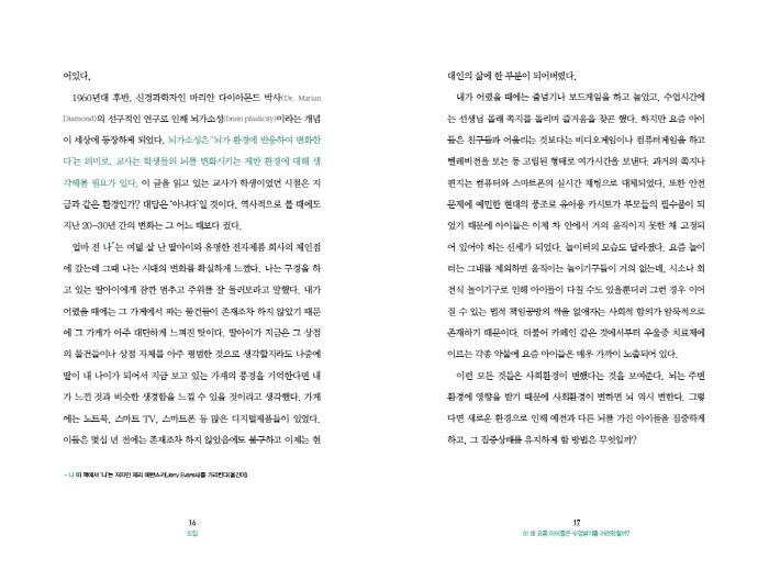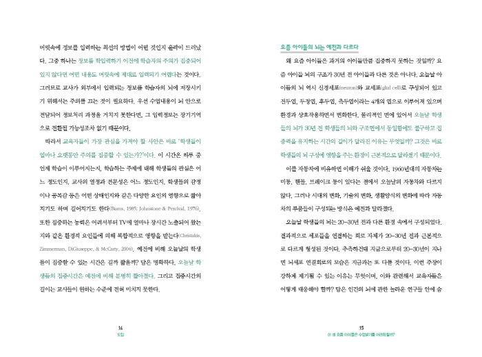 ¿Ö ¿äÁò ¾ÆÀ̵éÀº °ú°ÅÀÇ ¾ÆÀ̵鸸ŠÁýÁßÇÏÁö ¸øÇÏ´Â °ÍÀϱî? ¿äÁò ¾ÆÀÌµé ³úÀÇ ±¸Á¶°¡ 30³â Àü ¾ÆÀ̵é°ú ´Ù¸¥ °ÍÀº ¾Æ´Ï´Ù. ¿À´Ã³¯ ¾ÆÀ̵éÀÇ ³ú ¿ª½Ã ½Å°æ¼¼Æ÷(neuron)¿Í ±³¼¼Æ÷(glial cell)·Î ±¸¼ºµÇ¾î ÀÖ°í, ÀüµÎ¿±, µÎÁ¤¿±, Èĵο±, ÃøµÎ¿±À̶ó´Â 4°³ÀÇ ¿±À¸·Î ÀÌ·ç¾îÁ® ÀÖÀ¸¸ç ȯ°æ°ú »óÈ£ÀÛ¿ëÇÏ¸é¼ º¯ÈÇÑ´Ù. ¹°¸®ÀûÀÎ ¸é¿¡ ÀÖ¾î¼ ¿À´Ã³¯ ÇлýµéÀÇ ³ú°¡ 30³â Àü ÇлýµéÀÇ ³ú¿Í ±¸Á¶¸é¿¡¼ µ¿ÀÏÇÔ¿¡µµ ºÒ±¸Çϰí ÁýÁß·ÂÀ» À¯ÁöÇÏ´Â ½Ã°£ÀÇ ±æÀ̰¡ ´Þ¶óÁø ÀÌÀ¯´Â ¹«¾ùÀϱî? ±×°ÍÀº ¹Ù·Î ÇлýµéÀÇ ³ú ±¸¼º¿¡ ¿µÇâÀ» Áִ ȯ°æÀÌ ±Ùº»ÀûÀ¸·Î ´Þ¶óÁ³±â ¶§¹®ÀÌ´Ù. (p.15)