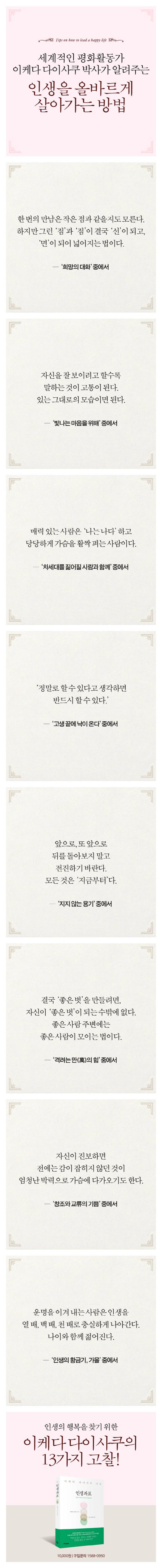 ¸¹Àº À§Àο¡°Ô´Â ÀþÀº ½ÃÀý, ¹Ýµå½Ã¶ó°í ÇØµµ °ú¾ðÀÌ ¾Æ´Ò Á¤µµ·Î Àλý¿¡ Å« ¿µÇâÀ» ³¢Ä£ Ã¥ÀÌ ÀÖ´Ù. ±× Ã¥Àº ÀÚ½ÅÀ» °Ý·ÁÇØ ÁÖ°í À̲ø¾î ÁÖ´Â µ¿½Ã¿¡ Ä£ÇÑ ¹þÀ̱⵵ Çϰí, ½º½ÂÀ̶ó°íµµ ÇÒ ¼ö ÀÖ´Ù. µ¶¼¿¡´Â ÀλýÀÇ ²ÉÀÌ ÀÖ°í, °ÀÌ ÀÖ°í, ±æÀÌ ÀÖ°í, ¿©ÇàÀÌ ÀÖ´Ù. º°ÀÌ ÀÖ°í, ºûÀÌ ÀÖ°í, Áñ°Å¿òÀÌ ÀÖ°í, ºÐ³ë°¡ ÀÖ°í, Å©³ªÅ« °¨Á¤ÀÇ ¹Ù´Ù°¡ ÀÖ°í, Áö¼ºÀ̶ó´Â ¹è°¡ ÀÖ°í, ³¡¾ø´Â ½ÃÁ¤(ãÌï×)ÀÇ ¹Ù¶÷ÀÌ ÀÖ´Ù. ²ÞÀÌ ÀÖ°í, µå¶ó¸¶°¡ ÀÖ°í, ¼¼°è°¡ ÀÖ´Ù.