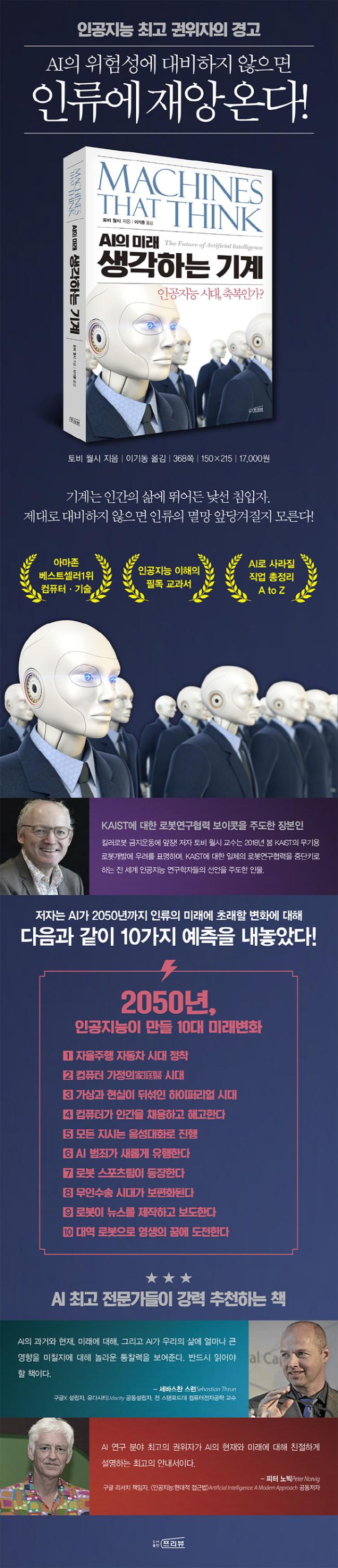 »ý°¢ÇÏ´Â ±â°è¸¦ ¸¸µå´Â ÀÏÀº ¼º°øÇÑ´Ù¸é ÀǽÉÀÇ ¿©Áö¾øÀÌ ¿ì¸® »çȸ¿¡ ¾öû³ ¿µÇâÀ» ¹ÌÄ¥ ´ã´ëÇϰí ÀÇ¿åÀûÀÎ ³ë·ÂÀÌ´Ù. ¸¶Áö¸· ¼¼ ¹øÂ° ÆÄÆ®¿¡¼´Â AIÀÇ ¹Ì·¡¿¡ ´ëÇØ º¸´Ù »ó¼¼È÷ ´Ù·ç¾ú´Ù. ¸¹Àº Ã¥ÀÚ¿Í ¿µÈ ¼Ó¿¡¼ ±¸Ã¼ÀûÀÎ ±Ù°Å ¾øÀÌ ¿¹°ßÇÑ ÀϵéÀÌ ½ÇÁ¦ Çö½Ç·Î ³ªÅ¸³¯ °ÍÀΰ¡? ¾Æ´Ï¸é ±×·± ÀϵéÀº °ø»ó°úÇÐÀÌ ±×¸° ´Ü¼øÇÑ Ç㱸¿¡ ±×Ä¥ °ÍÀΰ¡? ³ª´Â ´Ù¼Ò ¸ðÇèÀûÀÎ ½Ãµµ·Î AI°¡ 2050³â±îÁö ÀηùÀÇ ¹Ì·¡¿¡ ÃÊ·¡ÇÒ º¯È¿¡ ´ëÇØ 10°¡Áö ¿¹ÃøÀ» ÇØº¸¾Ò´Ù. ±× °¡¿îµ¥´Â ¿©·¯ºÐÀÌ ³î¶ö¸¸ÇÑ ¿¹°ßµéµµ µé¾î ÀÖÀ» °ÍÀÌ´Ù.