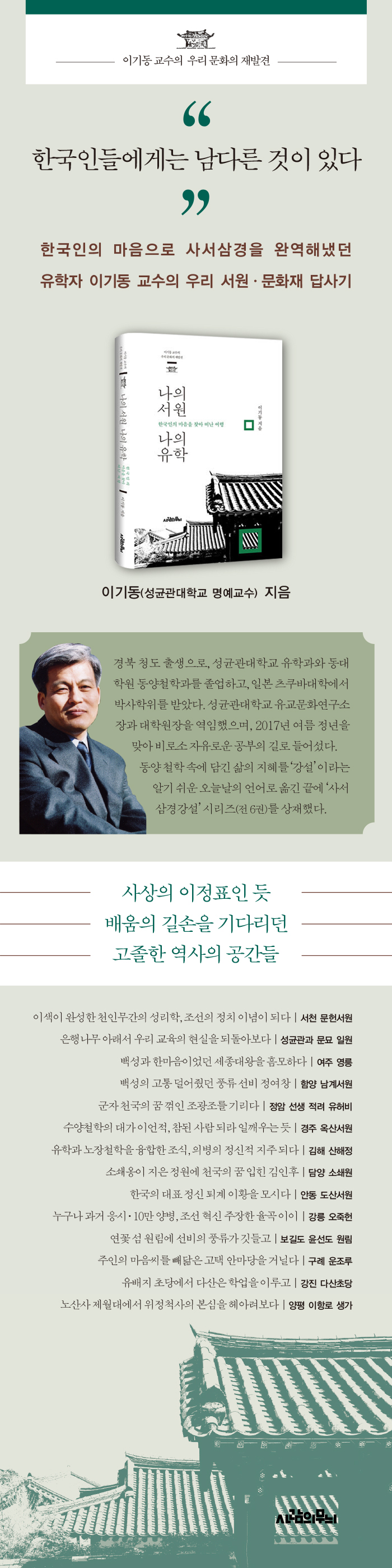 (1951.00.00)¼º±Õ°ü´ëÇб³ À¯Çаú¸¦ Á¹¾÷ÇÏ°í °°Àº ´ëÇÐ ´ëÇпø µ¿¾çöÇаú¿¡¼ ¼®»çÇÐÀ§¸¦, ÀϺ» ¾²Äí¹Ù(õè÷î) ´ëÇп¡¼ ¹Ú»çÇÐÀ§¸¦ ¹Þ¾Ò´Ù. ÇöÀç ¼º±Õ°ü´ëÇб³ À¯ÇÐ/µ¿¾çÇкΠ±³¼ö·Î ÀçÁ÷Çϰí ÀÖÀ¸¸ç 1988³â°ú 1998³â °¢°¢ ´ë¸¸ ±¹¸³Á¤Ä¡´ëÇаú ¹Ì±¹ ÇϹöµå ´ëÇÐ ¿ºÄª ¿¬±¸¼Ò¿¡ ÃʺùµÇ¾î ¿¬±¸¿øÀ¸·Î Ȱµ¿Çϱ⵵ Çß´Ù. °¥¼ö·Ï È¥Å¹ÇØÁö´Â ¼¼»ó¿¡ µ¿¾çöÇÐÀÇ °¡Ä¡¸¦ ¹Ù·Î ¼¼¿ö ¿À´ÃÀ» »ì¾Æ°¡´Â »ç¶÷µé¿¡°Ô »îÀÇ ÁöÇý¸¦ ÀüÇϰíÀÚ ±×´Â, ´Ù¾çÇÑ È°µ¿À» ÆîÄ¡°í ÀÖ´Ù. µ¿¾ç ÃÖ°íÀÇ °ÉÀÛ ¡ºÁÖ¿ª¡»À» Çö´ë¿¡ ¸Â°Ô ÀçÇØ¼®ÇÏ¿© Ãâ°£ÇÏ°Ô µÈ °Íµµ ±× ÀÏȯÀÌ´Ù. ¶Ç µ¿¾çöÇÐÀÌ µüµüÇÏ°í ¾î·Á¿î Çй®ÀÌ ¾Æ´Ï¶ó »ýȰ¿¡¼ Ä£±ÙÇÏ°Ô Á¢ÇÒ ¼ö ÀÖ´Â »ì¾Æ ÀÖ´Â »îÀÇ ÁöÇý°¡ µÉ ¼ö ÀÖµµ·Ï ÀϹÝÀεéÀ» À§ÇÑ µ¿¾çöÇÐ °´ç(Ë»ÓÑ) ¡®µ¿Àμ¿ø¡¯À» ¿¾î 10³â° °ÀǸ¦ Çϰí Àֱ⵵ ÇÏ´Ù. ÁöÀº Ã¥À¸·Î´Â ¡ºµ¿¾ç »ï±¹ÀÇ ÁÖÀÚÇС»¡º¸¸È·Î º¸´Â ÁÖ¿ª »ó¡¤ÇÏ¡»¡º´ëÇÐ Áß¿ë °¼³¡»¡º³í¾î °¼³¡»¡º¸ÍÀÚ °¼³¡»¡ºÁÖ¿ª °¼³¡»¡º±âµ¶±³¿Í µ¿¾ç »ç»ó¡»¡º³í¾î¿¡¼ ¾ò´Â ÁöÇý¡»¡ºÀåÀÚ¿¡¼ ¾ò´Â ÁöÇý¡»¡ºÁÖ¿ª¿¡¼ ¾ò´Â ÁöÇý¡»¡ºÇѱ¹ÀÇ À§±â¿Í ¼±Åỡº°õÀÌ ¼º°øÇÏ´Â ³ª¶ó¡» µîÀÌ ÀÖÀ¸¸ç ÁÖ¿ä ³í¹®À¸·Î ¡¸Çѱ¹ ¼º¸®Çп¡ ÀÖ¾î¼ÀÇ À̱â·ÐÀÇ ¼ö¿ë°ú Àü°³¡¹¡¸À²°î»ç»ó°ú °æÁ¦Á¤Ã¥¡¹¡¸À¯±³¹®ÈÀÇ º¸Æí¼º°ú Ư¼ö¼º¡¹¡¸¹üÇÐÀüÆí¿¡ °üÇÑ ¼Ò°í¡¹¡¸ÀϺ»À¯Çп¡ ÀÖ¾î¼ÀÇ Áß¼¼Àû »çÀ¯ÀÇ Çü¼º°ú ±Øº¹¡¹ µî ´Ù¼öÀÌ´Ù.