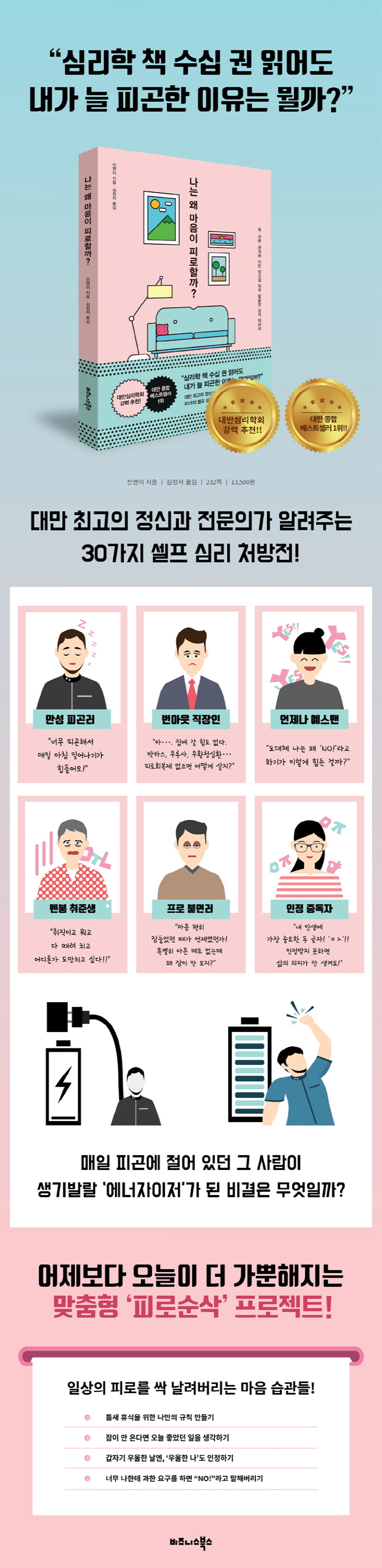 ´ë¸¸ ÃÖ°íÀÇ Á¤½Å°ú Àü¹®ÀÇ. ¿þÀ̽¬ ¸¶À½»ó´ã¼ÒÀÇ ¿øÀåÀÌÀÚ º£½ºÆ®¼¿·¯ ÀÛ°¡ÀÌ´Ù. ´ë¸¸¿ì¿ïÁõ¹æÁöÇùȸ, ´ë¸¸½É¸®Ä¡·áÇÐȸ¿¡¼ Ȱµ¿ÇÏ¸ç ½ºÆ®·¹½º¿Í ºÒ¸éÁõ, ¿ì¿ïÁõ µî Çö´ëÀÎÀÌ °Þ´Â ¸¶À½ÀÇ ÇǷΰ¨À» ´ú¾îÁÖ°í Ä¡À¯ÇÏ´Â µ¥ ³ë·ÂÇϰí ÀÖ´Ù. ´ëÇü º´¿ø¿¡¼ ¼ö¸¹Àº »ç¶÷µéÀ» »ó´ãÇß´ø ±×³à´Â ´ÜÆíÀûÀΠó¹æ¿¡¼ ¹þ¾î³ª ÁÖº¯ ȯ°æ, ¼º°Ý, °¡Á·»ç µî ³»´ãÀÚÀÇ »îÀ» ´Ù°¢µµ·Î ÀÌÇØÇÏ´Â °ÍÀ» Áß¿äÇÏ°Ô »ý°¢ÇÑ´Ù. ÀÌó·³ ±Ùº»ÀûÀÎ Á¢±Ù¿¡¼ ½ÃÀÛÇÏ´Â ±×³àÀÇ »ó´ã ½É¸® °ÀÇ´Â ÀÔ¼Ò¹®À» Ÿ°í Àü±¹ÀûÀ¸·Î Å« ÈÁ¦¸¦ ºÒ·¯ÀÏÀ¸Ä×°í, ±×³à´Â ¡®³» ¸¶À½À» ³ªº¸´Ù ´õ Àß ¾Æ´Â Àǻ硯¶ó´Â ¼ö½Ä¾î¸¦ ¾ò±âµµ Çß´Ù. ÀÌ Ã¥Àº ¿øÀκҸíÀÇ ¸¸¼º ÇÇ·Î¿Í ½ºÆ®·¹½º¿¡ ÁöÃÄ ¾îÂîÇÒ ÁÙ ¸ð¸£´Â »ç¶÷µé¿¡°Ô ±×³à°¡ º¸³»´Â ¼¿ÇÁ ½É¸® ó¹æÀüÀÌ´Ù. ¸¶À½ÀÌ ´Ü´ÜÇØÁö´Â ¸¶Àεå¼ÂºÎÅÍ ½ºÆ®·¹½º ÇØ¼Ò¹ý±îÁö, ÀÏ»óÀÇ ÀÛÀº º¯È·Î ¸ö°ú ¸¶À½ÀÌ °¡º¿öÁö´Â ±¸Ã¼ÀûÀÌ°í ½Ç¿ëÀûÀÎ ÇÇ·Îȸº¹ ³ëÇϿ츦 Á¦½ÃÇÑ´Ù.