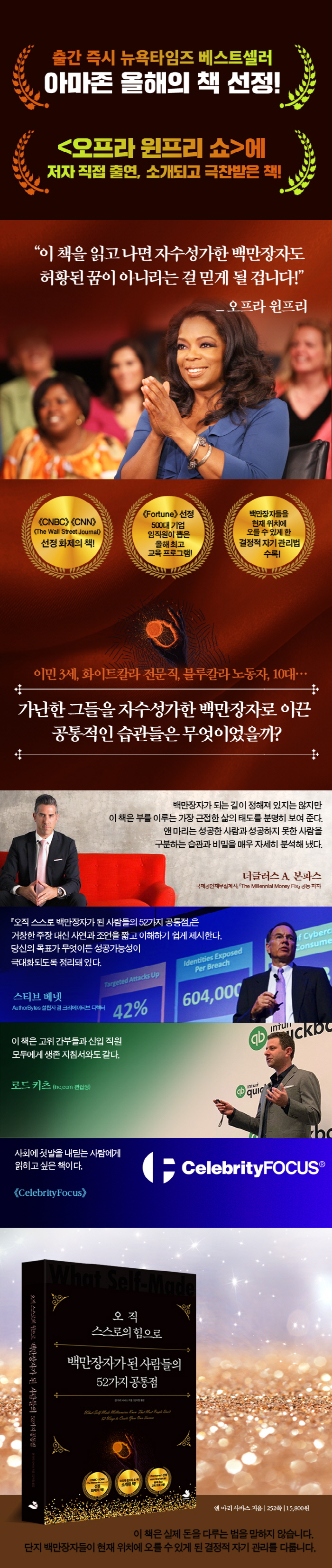 ¡º¿ÀÁ÷ ½º½º·ÎÀÇ ÈûÀ¸·Î ¹é¸¸ÀåÀÚ°¡ µÈ »ç¶÷µéÀÇ 52°¡Áö °øÅëÁ¡¡»Àº Ãâ°£ ÈÄ <¿ÀÇÁ¶ó À©ÇÁ¸® ¼î>¿¡ ¼Ò°³µÇ¸ç ±× °¡Ä¡¸¦ ÀÎÁ¤¹ÞÀº Ã¥ÀÌ´Ù. Ã¥Àº ÀúÀÚ°¡ ½ÇÁ¦ ¹é¸¸ÀåÀÚ ¼ö½Ê ¸íÀ» ÀÎÅͺäÇØ ±×µéÀÌ ±×·¯ÇÑ ºÎ¸¦ ¾òÀ» ¼ö ÀÖ¾ú´ø °áÁ¤Àû ºñ°áµéÀ» ´ã¾Ò´Ù. ƯÀÌÇÑ Á¡Àº 100¸í ÀÌ»óÀÇ ¹é¸¸ÀåÀڷκÎÅÍ ¾òÀº °¢°¢ÀÇ ³ëÇϿ찡 ¾Æ´Ñ, ±×µé ¸ðµÎ·ÎºÎÅÍ °øÅëÀûÀ¸·Î µéÀº 52°¡ÁöÀÇ ºñ°áÀ» ´ã°í ÀÖ´Ù´Â Á¡ÀÌ´Ù. ÀÌ Ã¥¿¡ µîÀåÇÏ´Â ¹é¸¸ÀåÀÚµéÀº Å͹«´Ï¾ø¾î º¸ÀÏ Á¤µµÀÇ ºÎ¸¦ ÃàÀûÇÑ »ç¶÷ÀÌ ¾Æ´Ï´Ù. Ã¥¿¡´Â ³Ê¹« ºÎÀÚ¶ó¼ ´©±¸³ª ´Ù ¾Æ´Â »ç¶÷ÀÇ À̾߱â´Â ¾ø´Ù. ¿ÀÈ÷·Á °æÁ¦ÀûÀ¸·Î ¾î¿ ¼ö ¾øÀÌ µ¶¸³Çؾ߸¸ Çß´ø Æò¹üÇÑ »ç¶÷µéÀÌ ÇöÀçÀÇ ºÎ¸¦ °®´Â µ¥ °¡Àå Å« ¿ªÇÒÀ» ÇÑ »îÀÇ Åµµ¿Í »ý°¢ÀÇ ±âƲÀ» ´Ù·é´Ù.