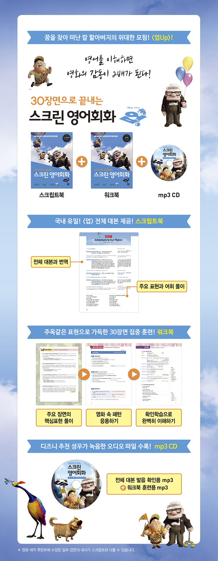 ¿µ¾î °í¼öµéÀÌ ÀÔÀ» ¸ð¾Æ ÃßõÇÏ´Â °¡Àå È¿°úÀûÀÎ ¿µ¾î ÇнÀ¹ýÀº ¿µÈ ´ëº»À» Ȱ¿ëÇÏ´Â °ÍÀÌ´Ù. ƯÈ÷ ¾Ö´Ï¸ÞÀ̼ÇÀº ¹®Àå ±¸Á¶°¡ º¹ÀâÇÏÁö ¾Ê°í ½Ç»ýȰ¿¡¼ ÀÚÁÖ ¾²´Â Ç¥ÇöÀ¸·Î °¡µæÇϱ⠶§¹®¿¡ ¿µ¾î ÇнÀ¿¡ Á¦°ÝÀÌ´Ù. ÀÌ Ã¥Àº ±¹³» À¯ÀÏ <¾÷(Up)>ÀÇ Àüü ´ëº»À» Á¦°øÇÏ¸ç ¸ðµç ´ë»ç¸¦ ¿µÇѴ뿪À¸·Î È®ÀÎÇÒ ¼ö ÀÖ´Ù. ¶ÇÇÑ ¿µÈ ¼Ó ÁÖ¿ä 30Àå¸éÀ» ¿öÅ©ºÏ¿¡¼ ÁýÁß ÈÆ·ÃÇÏ¿© À¯¿ëÇÑ Ç¥ÇöÀ» ÁýÁßÀûÀ¸·Î ÇнÀÇÒ ¼ö ÀÖ´Ù. µðÁî´Ï Ãßõ ¼º¿ì°¡ ³ìÀ½ÇÑ mp3 CD¸¦ Á¦°øÇÏ¿© ¿µÈ¸¦ µ¹·Áº¸Áö ¾Ê¾Æµµ Á¤È®ÇÑ ¹ßÀ½À» È®ÀÎÇÒ ¼ö ÀÖ´Ù´Â °Íµµ ÀÌ Ã¥ÀÇ ÀåÁ¡ÀÌ´Ù. ½ºÅ©¸³Æ®ºÏ°ú ¿öÅ©ºÏ Àü 2±Ç ±¸¼º
